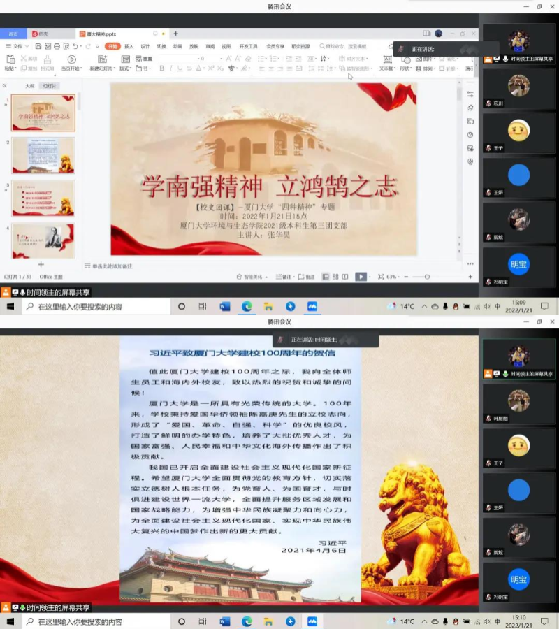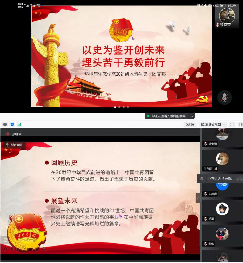 环境与生态学院2021级本科生第一团支部于线上召开了“以史为鉴开创未来,埋头苦干勇毅前行”主题团课。