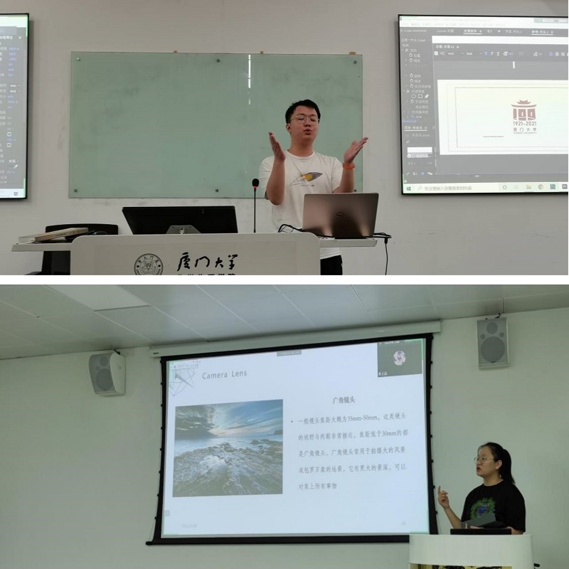 2018级本科生耿世辰与2019级本科生王蕊主讲摄影剪辑模块。其中有Premier教学、单反相机的使用等十分重要的实用技巧,形象生动的教学让同学们能轻松地理解Premier选择工具栏以及顶部工具栏的组成和功能,学会如何调整摄像机的模式与快门速度,掌握照相时的横平竖直拍摄原则、三分法、九宫格构图等等。