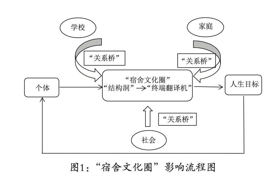 综上,宿舍首先是因为其空间的特殊性成为一个“结构洞”,在这个“结构洞”里它可以不加过滤、不经甄别地吸收各种各样的信息,成为一个连接社会各个层面与大学生信息嫁接的“信息桥”。最后,宿舍借助“信息桥”的信息功能,在个体主观能动性的发挥作用下,充当起一个信息“终端翻译机”的角色,将社会上大量的信息重新解读、重新认识,从而帮助青年个体制定人生目标并为之努力。(见图1)
