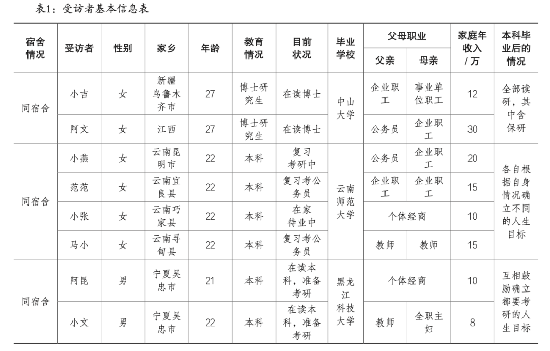 将宿舍作为本文的一个分析框架,可以跳出传统社会学在青年社会流动领域研究中集中于家庭背景、教育等结构性因素影响的讨论框架,构建一个新的研究载体。宿舍在一定程度上打破了社会阶层在青年社会互动和交往中的聚合作用,将来自不同家庭和背景的同学联系在一起,在大学生活的几年中,青年可以在有限的范围内突破社会阶层的影响,充分发挥其主观能动性。因此,对宿舍这一特殊场域的研究可以帮助我们集中讨论青年主观能动性能够在多大程度上,以及在何种条件下影响青年的人生规划和目标实现。