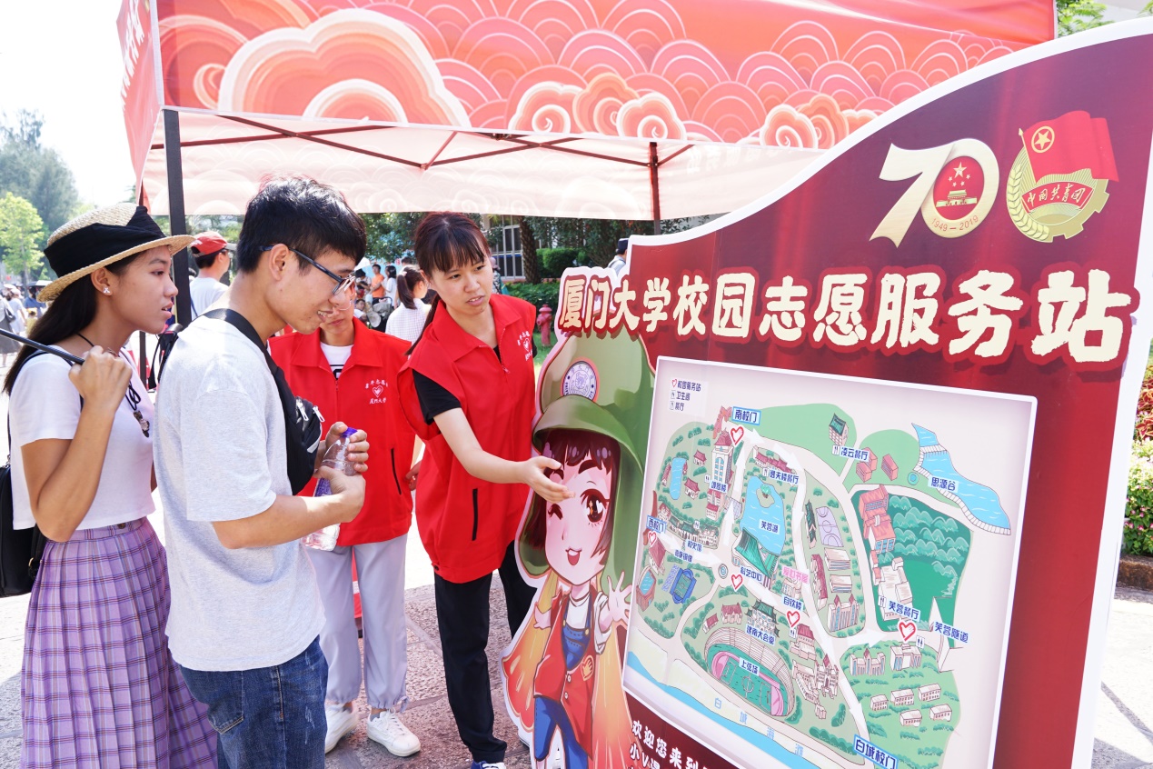今年国庆期间,校团委党支部在思明校区设立了5个服务点:群贤校门,大南校门,科艺中心前,三家村广场,芙蓉隧道口,共招募志愿者133名。值得一提的是,今年的服务站还特别增加了垃圾分类投放引导、劝导隧道乱涂乱画的职能,并增添了庆祝中华人民共和国成立70周年的元素,给校园更增加了喜庆的氛围。