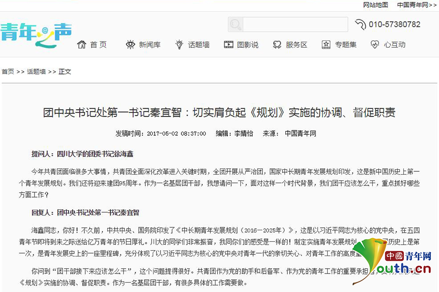 日前,《中长期青年发展规划(2016—2025年)》印发,这是新中国历史上第一个青年发展规划。对此,四川大学团委书记徐海鑫通过“青年之声”互动社交平台发出提问,他说:“今年共青团面临很多大事情,共青团全面深化改革进入关键时期,全团开展从严治团,国家中长期青年发展规划印发,我们还将迎来建团95周年。作为一名基层团干部,面对这样的时代背景,我们应该怎么干,重点抓好哪些方面的工作?”5月2日,秦宜智在“青年之声”社交互动平台上回复了徐海鑫的提问。