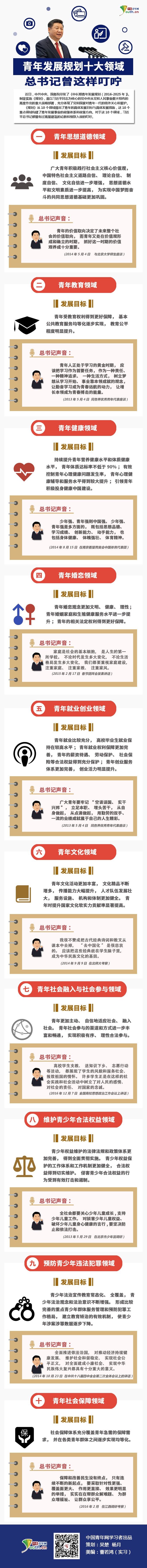 《规划》从思想道德、教育、健康、婚恋、就业创业、文化、社会融入与社会参与、维护合法权益、预防违法犯罪、社会保障等10个领域提出了青年的具体发展目标,并提出了具体发展措施。10个重点领域构建了青年发展事业的政策体系和政策方向。对于这10个领域,习近平总书记都曾有过高屋建瓴的论断和细致入微的叮咛。