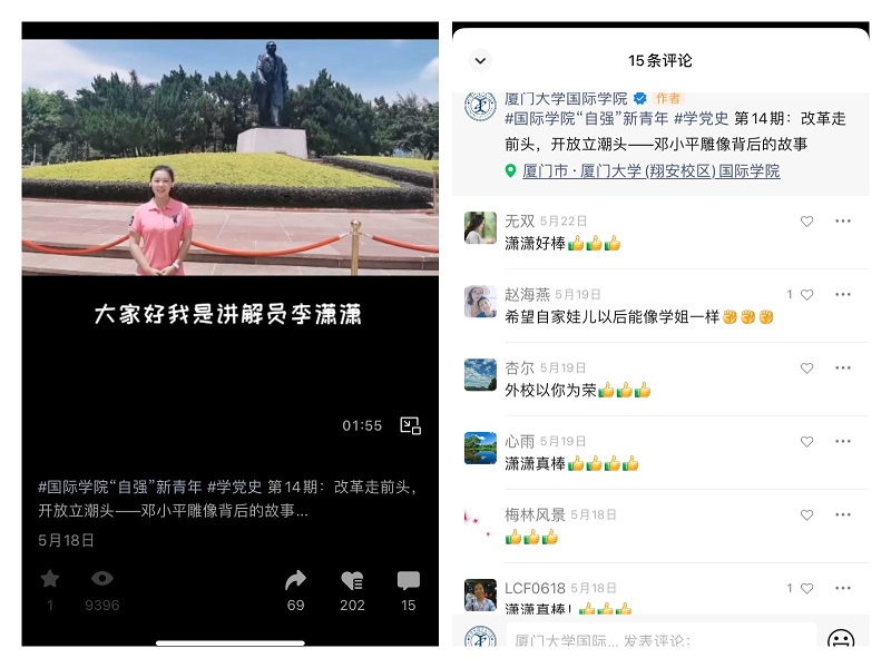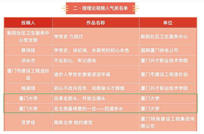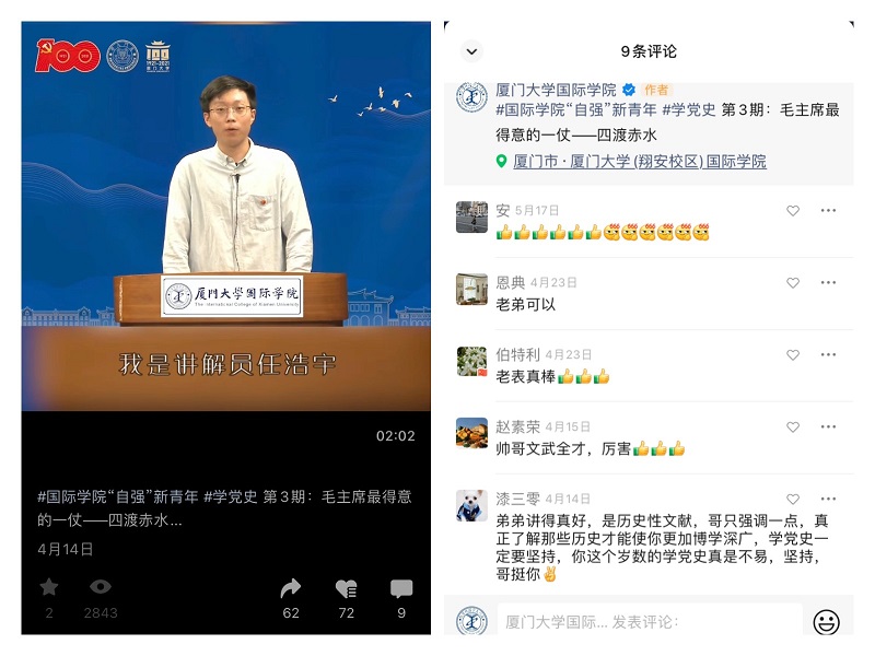 为庆祝中国共产党成立100周年,深入推进党史学习教育,中共厦门市委宣传部、厦门网联合举办“学党史·i分享”融媒体微理论文章、微理论视频征集活动,在全市范围内共遴选出100个入围作品并在8月13日-17日组织开展网络人气奖投票,截止活动结束,后台累计收到80多万票。经过激烈角逐,在最终产生的8个微理论视频人气奖中,国际学院《改革走前头,开放立潮头》及《毛主席最得意的一仗——四渡赤水》两个作品荣获厦门市“学党史·i分享”网络人气奖,占获奖数25%。在此次活动中,国际学院共有12个作品入围,不仅是入围数最多的单位,也是获奖数最多的单位,更是学校唯一一个获奖单位。