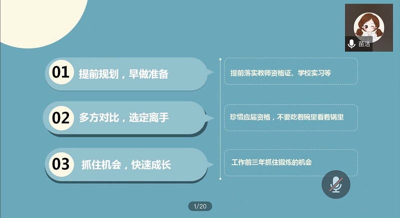 同为小学语文教师,现任职于厦门五缘第二实验学校的2014级苗洁学姐以她个人为例,分享了厦门教师的工作待遇和工作内容。苗洁学姐为有志从事教育行业的同学们提出了详细的求职与工作建议,如应提前规划,早做准备,提前落实教师资格证、学校实习等;她还提醒大家要多方对比每一份工作机会,珍惜应届资格;在教师成长方面,她说道,工作之后的前三年是能够成长最快的一段时间,一定要抓住机会,快速成长。