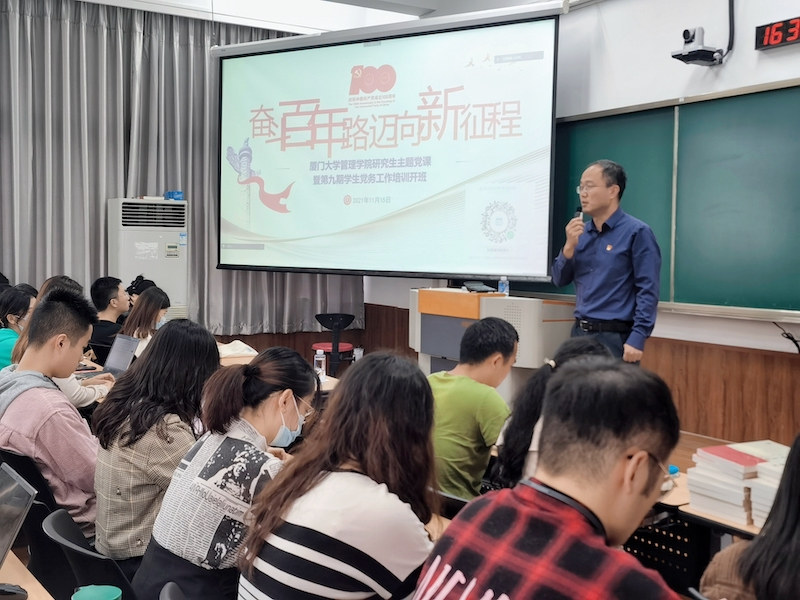 戴蓥作开班致辞并为与会人员讲授“奋斗百年路,迈向新征程”主题党课。他首先介绍了管理学院党组织的基本情况、党建工作的做法与成效,他提到,以“坚持理念先行,健全配套指导,加强示范引领”为思路,以“突出政治建设、组织建设、制度标准、先锋作用、品牌打造”为抓手,管理学院的党建工作基础得到夯实,学生支部焕发活力。在党课中,戴蓥带领全体研究生新生党员、各年级党支部委员一同学习了习近平总书记“七一”重要讲话精神,详细阐述了中国共产党百年来取得的伟大成就,解读了中国共产党伟大建党精神,并勉励青年党员们牢记初心使命,坚定理想信念,以自己的才干助推中华民族实现伟大复兴。