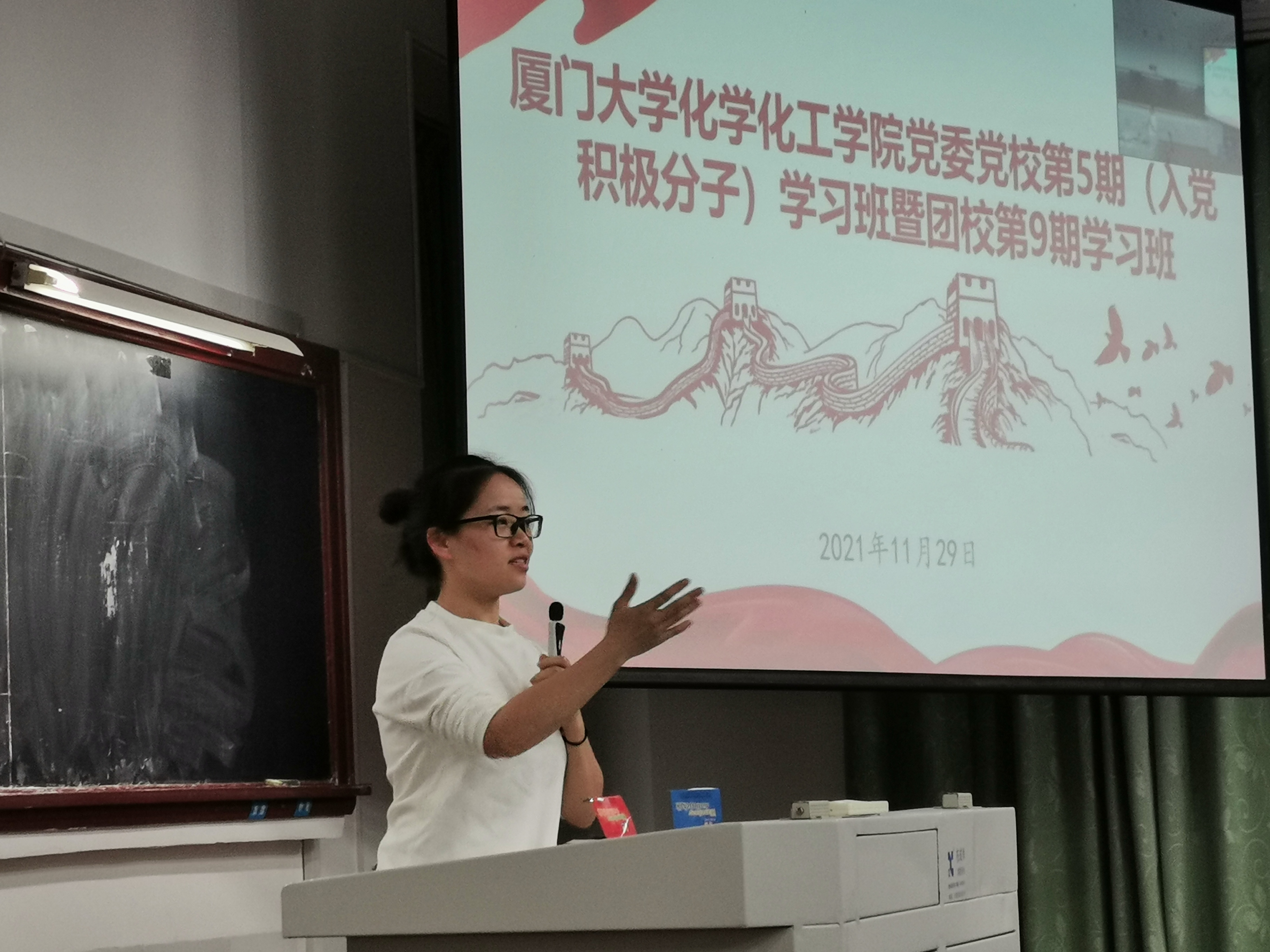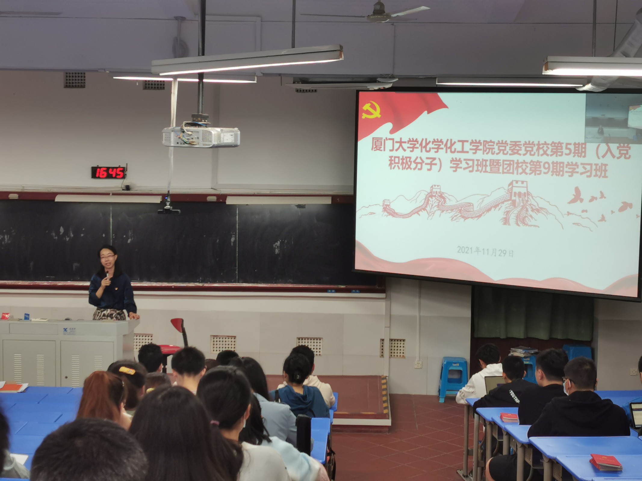 11月29日16时40分,厦门大学化学化工学院党委党校第五期(入党积极分子)学习班暨团校第九期学习班开班仪式在群贤二105顺利举办。学院团委书记刘恩恩、团委副书记杨家麒、辅导员王玲伟、兼职辅导员马思媛出席本次开班仪式。本次活动由学院团总支书记陈超凡主持,刘恩恩老师作开班动员,马思媛老师主讲。