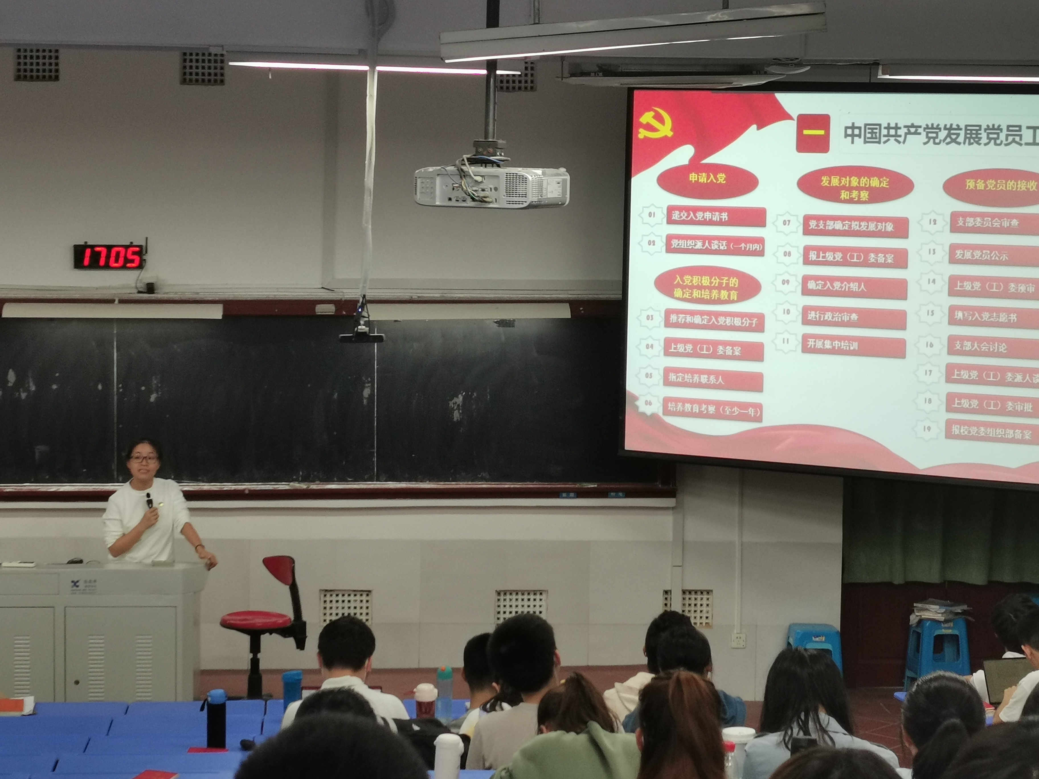 随后,马思媛老师向大家讲解了发展党员工作的流程,她首先解释了每位入党积极分子所属党支部的依据,并通过一段有关中国共产党发展党员工作基本程序的视频,生动形象地说明发展党员的28个小流程以及“申请入党”、“入党积极分子的确定和教育培养”、“发展对象的确定和考察”、“预备党员的接收”和“预备党员的教育考察和转正”5项具体内容。此外,马老师简明扼要地介绍了发展党员的责任分工、纪律以及发展党员工作常用文书的书写和注意事项。