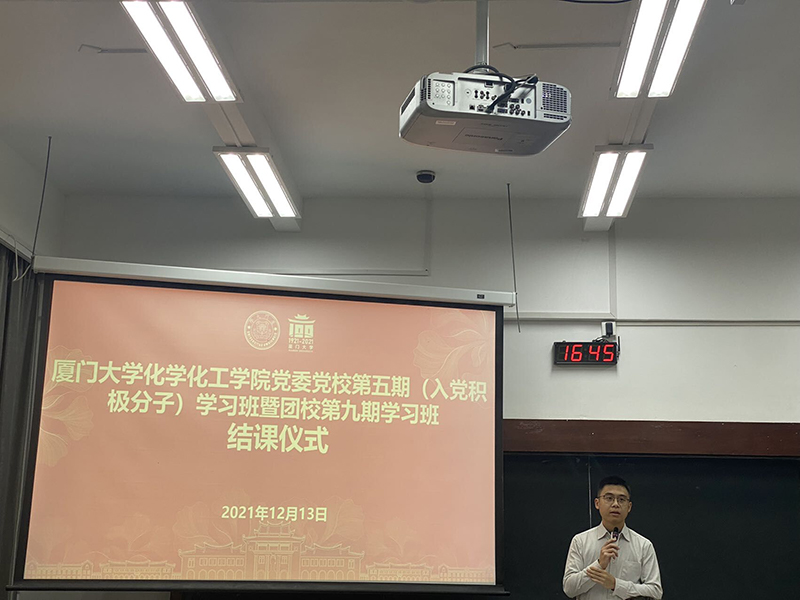 12月13日16时40分,厦门大学化学化工学院党委党校第五期(入党积极分子)学习班暨团校第九期学习班结业仪式在南强二105顺利举办。出席本次活动的嘉宾有学院团委书记刘恩恩老师、团委副书记杨家麒老师,本次活动由学院团总支综合事务部负责人张雨豪主持。