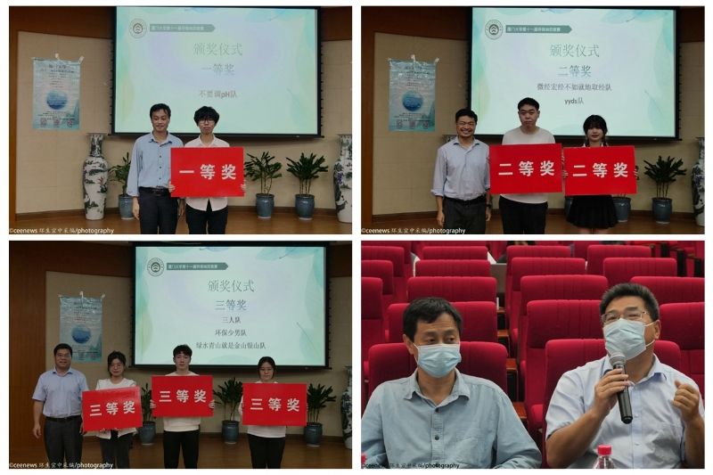 评委老师为获奖队伍颁奖,不要调pH队获一等奖,微经宏经不如就地取经队和yyds队获二等奖,三人队、环保少男队和绿水青山就是金山银山队获三等奖。
