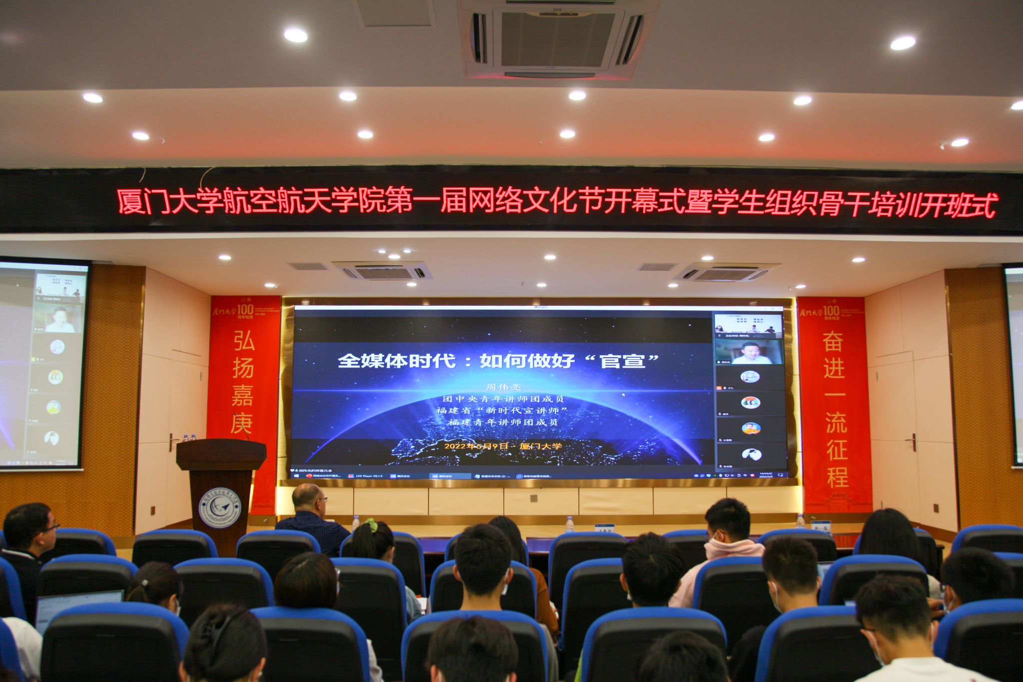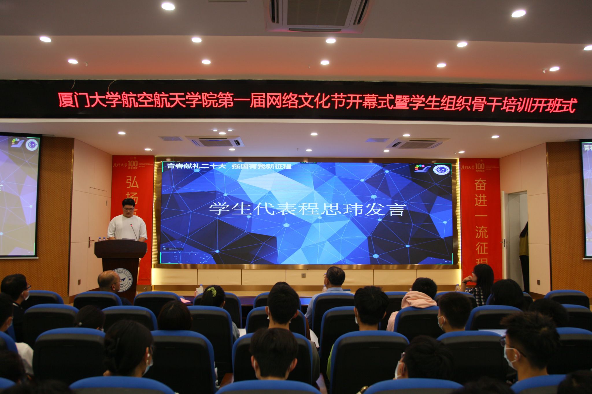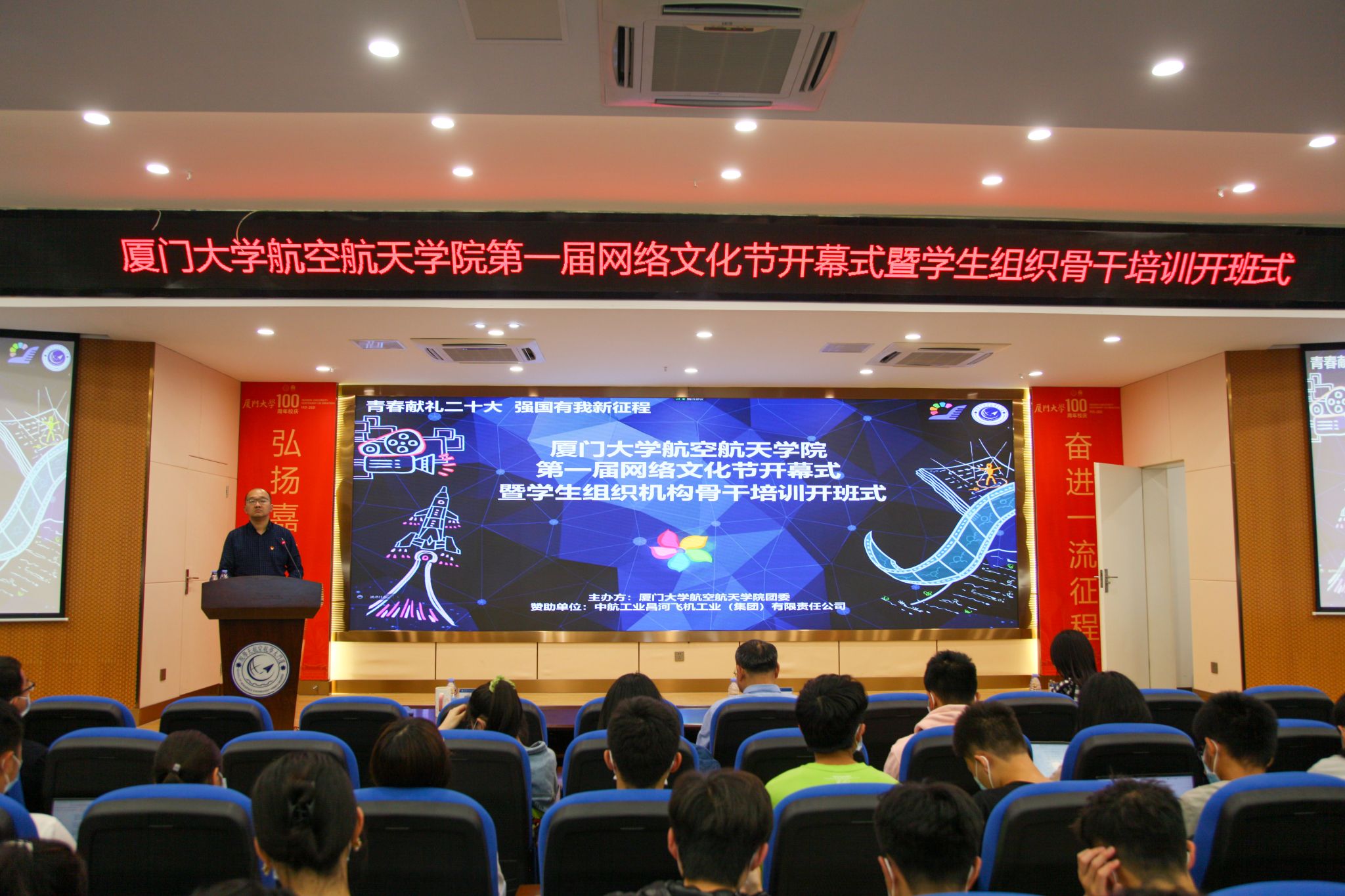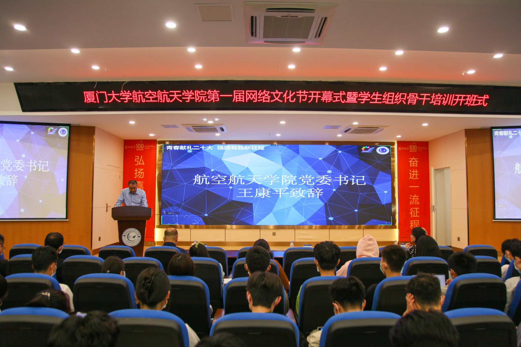 2022年5月9日下午,航空航天学院首届网络文化节开幕式暨学生组织骨干培训开班式在学院报告厅举行。共青团福建省委宣传部副部长周伟亮、学院党委书记王康平、翔安校区办公室主任兼学校办公室副主任薛志平、学生工作部(处)副部(处)长许美霞、翔安校区团工委书记兼校团委副书记林蕊出席活动,活动由学院党委副书记张晴主持。