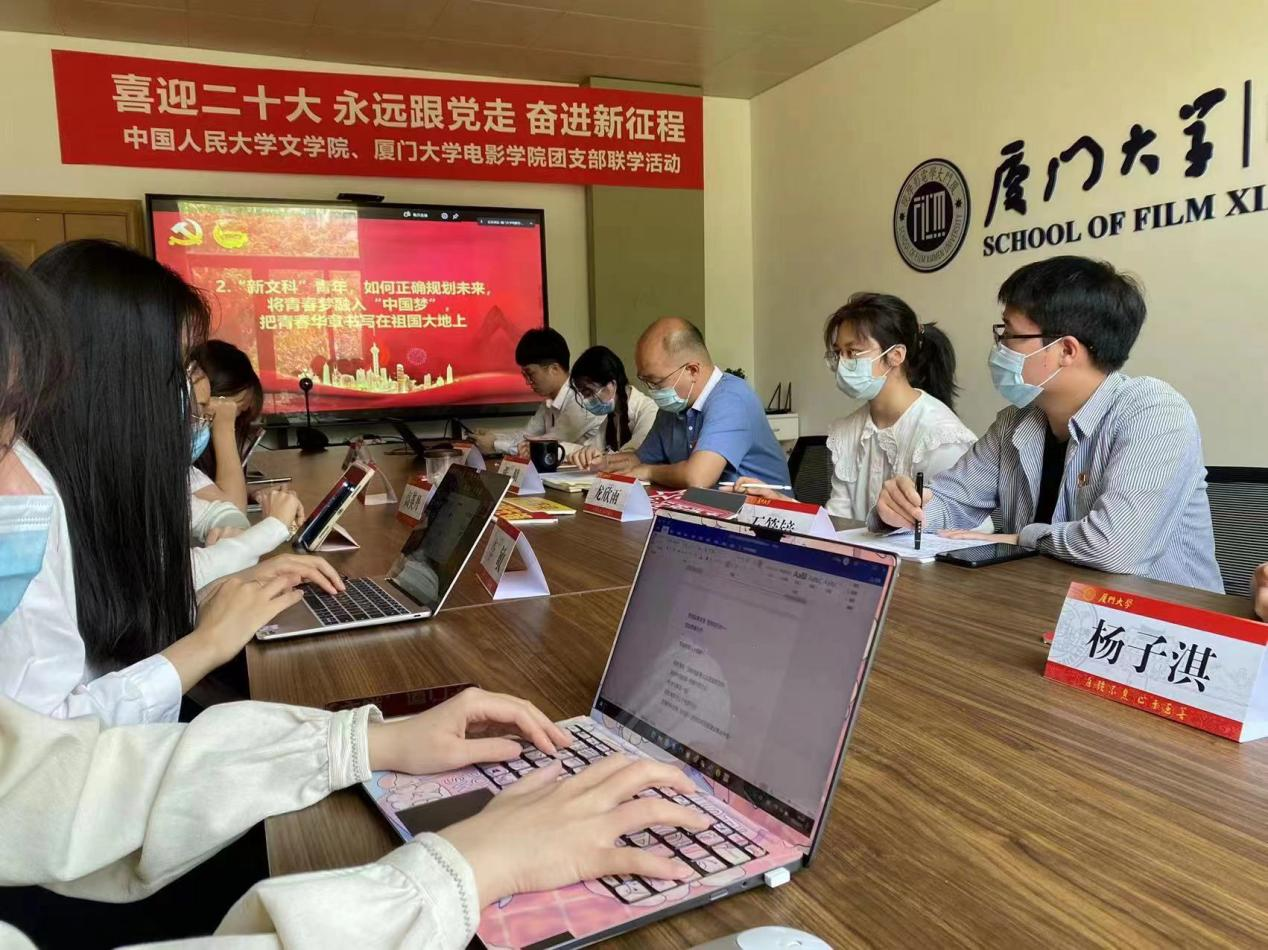 为迎接党的二十大胜利召开,庆祝中国共青团成立一百周年,深入学习贯彻习近平总书记在中国人民大学考察时的重要讲话精神,5月6日上午,厦门大学电影学院与中国人民大学文学院开展“喜迎二十大·永远跟党走·奋进新征程”团支部共建联学活动。