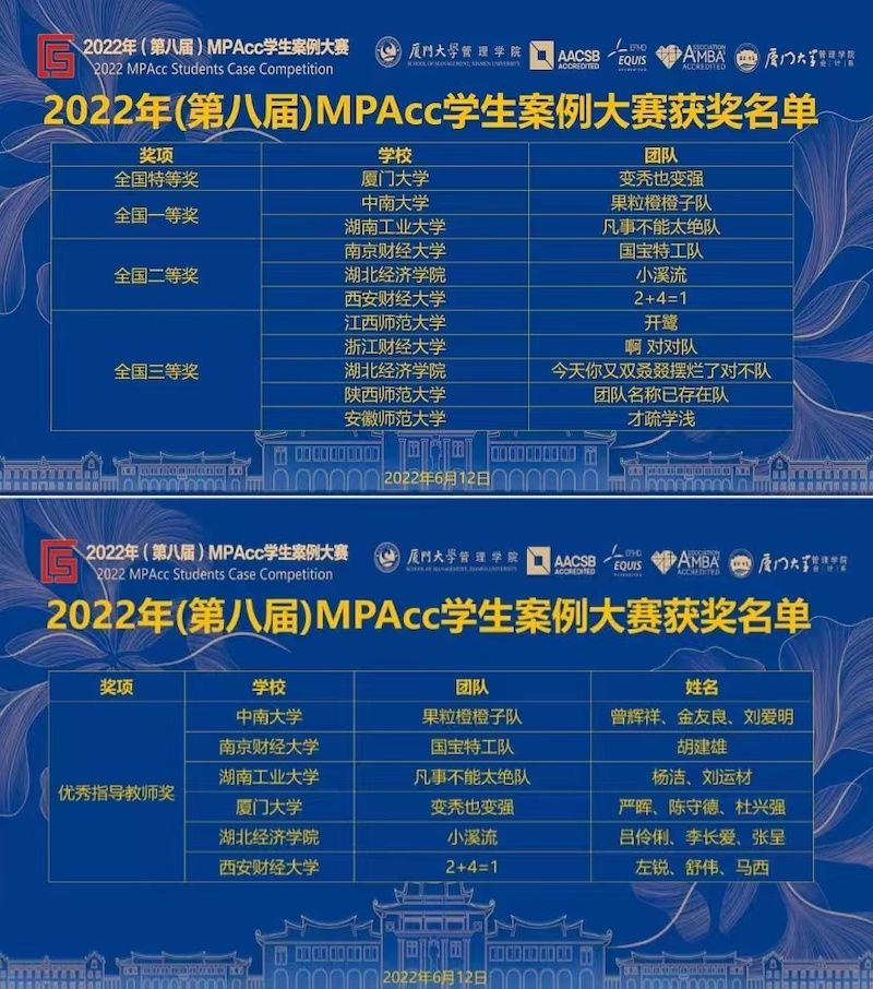 6月12日,2022年(第八届)MPAcc学生案例大赛决赛以线上、线下相结合方式成功举办。厦门大学管理学院会计学系MPAcc“变秃也变强”代表队勇夺冠军,获得本届大赛全国特等奖,系厦门大学管理学院会计学系在该项赛事中第三次问鼎。