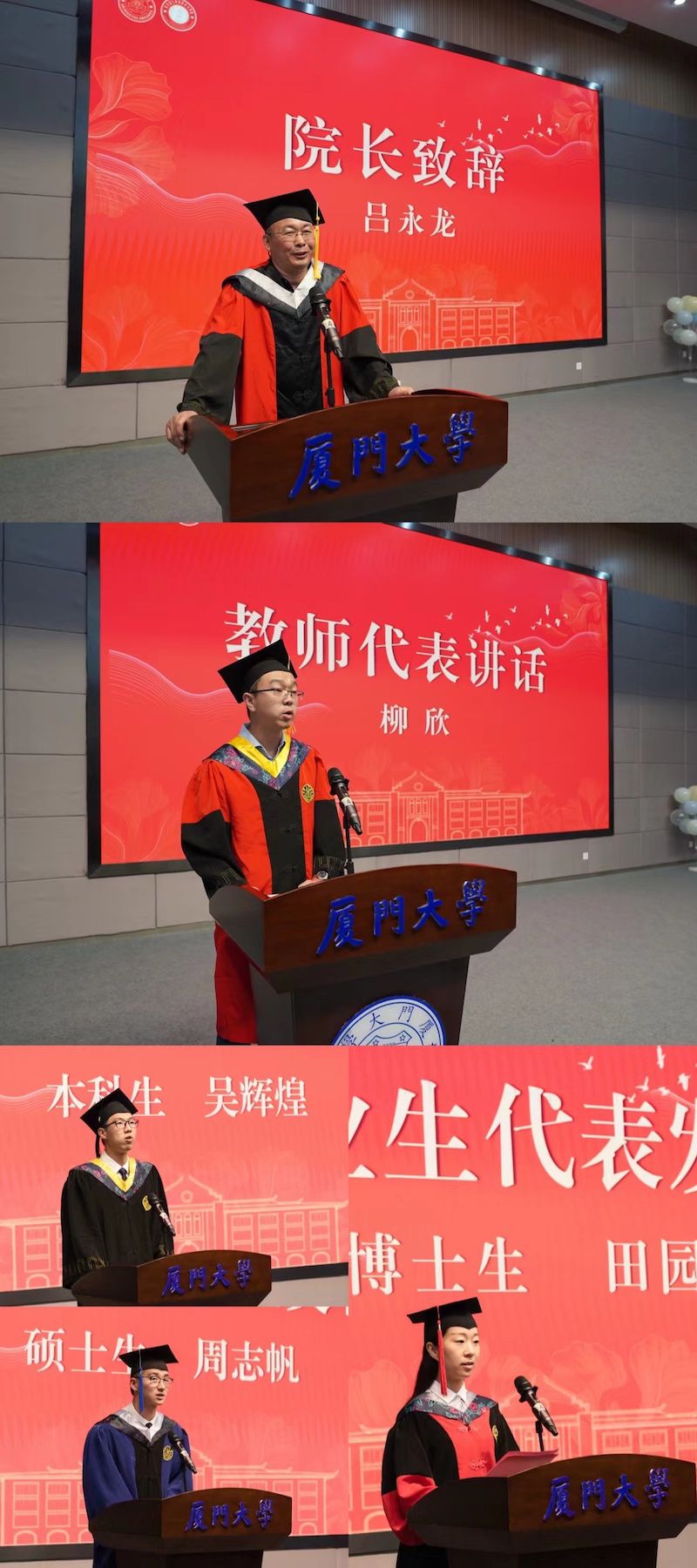 2022届本科毕业生代表吴辉煌、硕士毕业生代表周志帆、博士毕业生代表田园依次上台发言。他们回忆了过去多年在厦园的学习与生活,感谢学院和老师的悉心培养和关怀呵护,并呼吁全体毕业生生逢其时,肩负重任,当立鸿鹄之志,做青春的奋斗者、搏击者、奉献者。