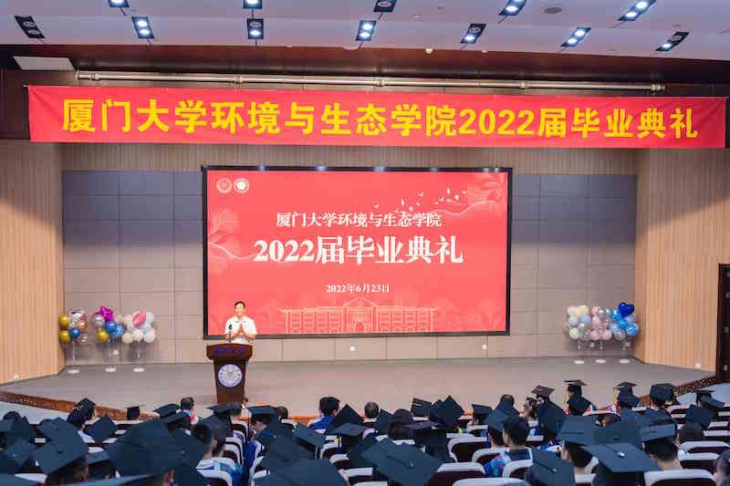 6月23日下午,环境与生态学院“环环相依 生生不忘”2022届毕业典礼在翔安校区德旺图书馆2号报告厅隆重举行。本次毕业典礼采取“线下+线上直播”的形式举行,学院全体领导班子成员,数学科学学院党委副书记(原学院党委副书记)毛通双,党委宣传部副部长(原学院党委副书记)李静,系负责人,毕业班班主任,任课教师、教学辅助老师、学院办公室老师、后勤物业工作人员代表,辅导员,2022届全体毕业生等现场观礼,其余师生、校友、学生亲友等在“云端”相聚,共同见证2022届200多名毕业生的重要时刻。毕业典礼由学院党委副书记蔡虎堂主持。