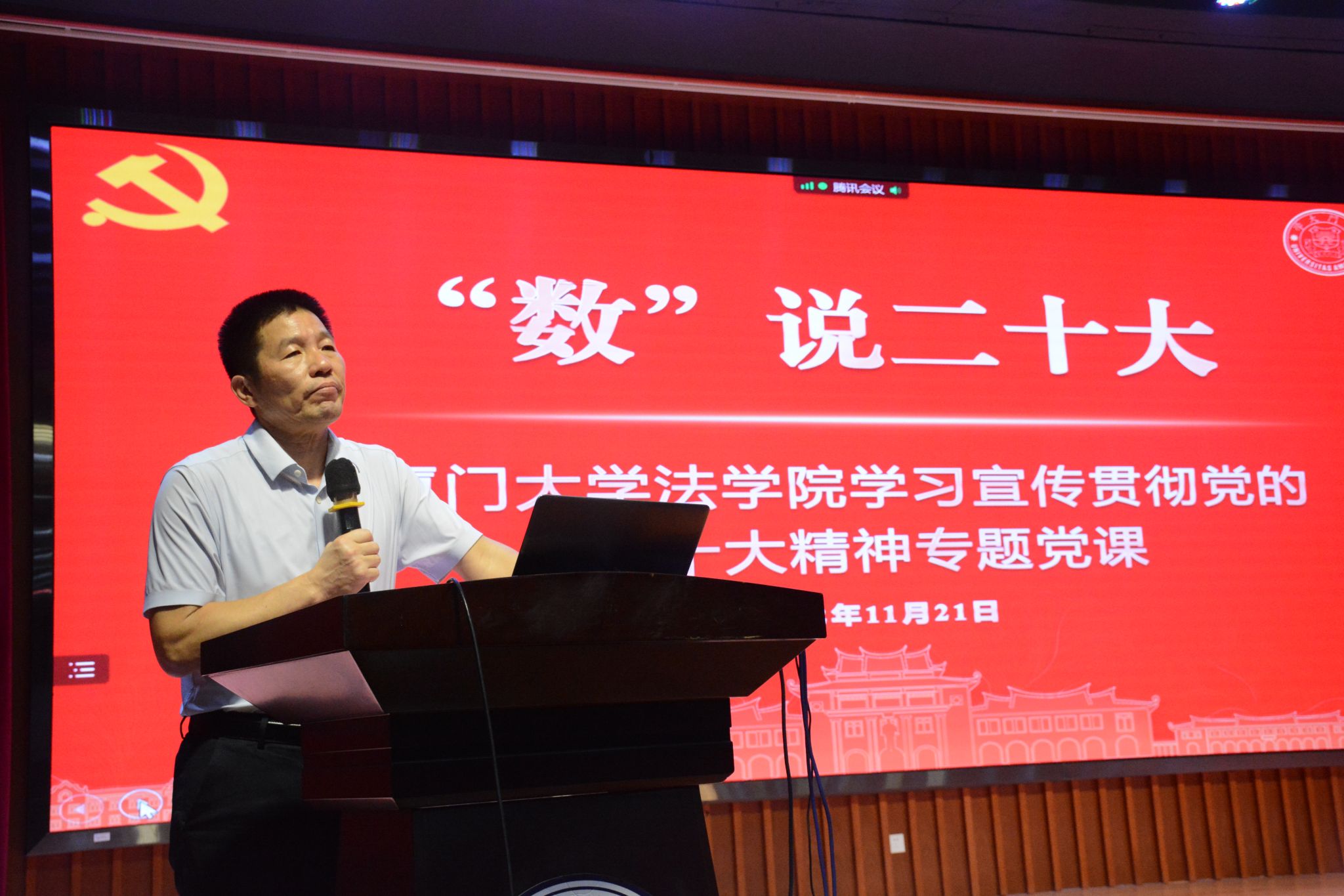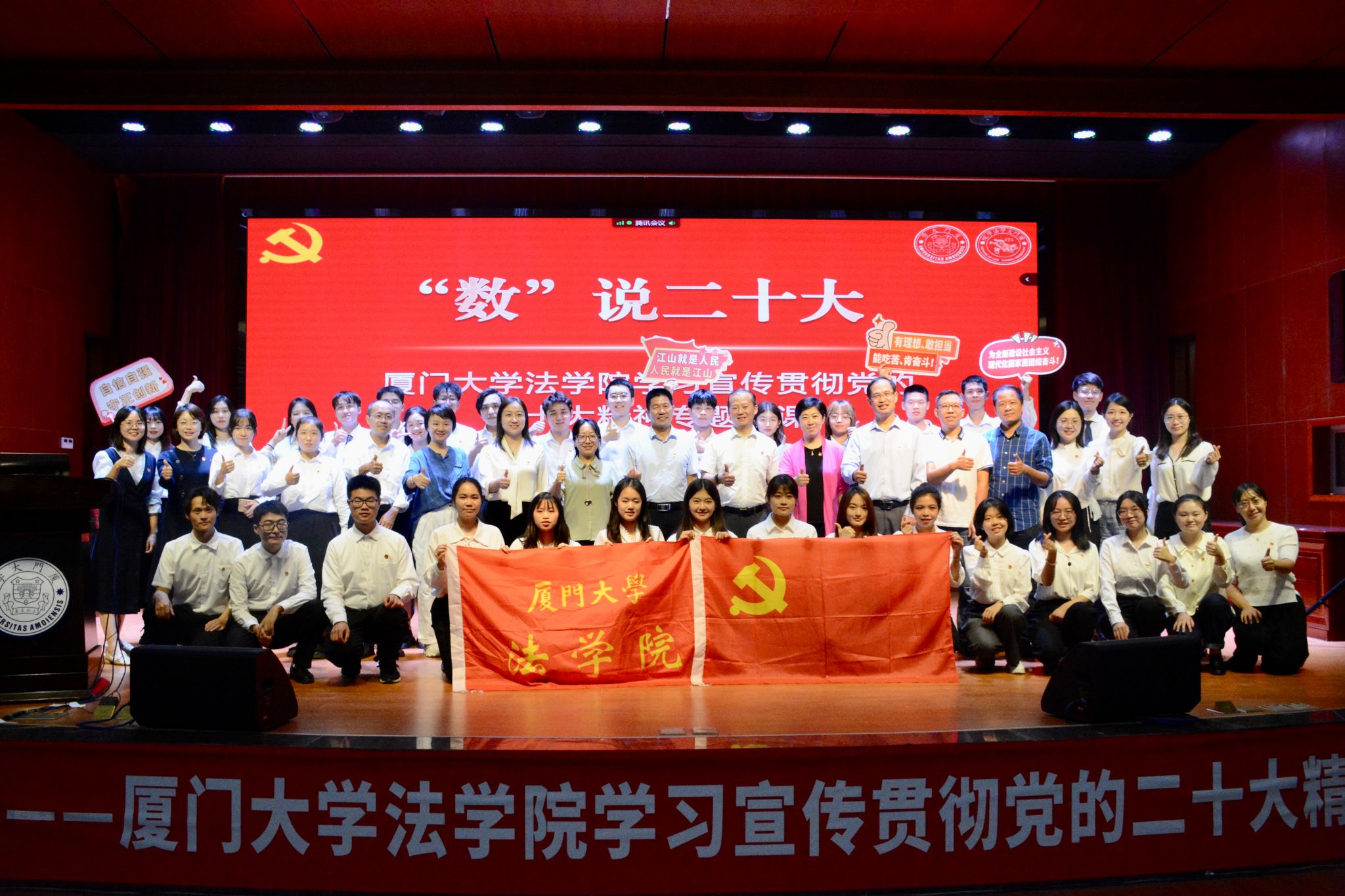 11月21日晚,法学院模拟法庭,红旗艳艳、党徽熠熠。十个党团支部从数字出发,解读、宣讲党的二十大报告。 “大会的主题明确宣示了我们党在新征程上举什么旗、走什么路、以什么样的精神状态、朝着什么样的目标继续前进。必须深刻领会大会主题,牢牢把握新时代新征程中国共产党的中心任务,锲而不舍,久久为功。”2022级法硕第一党支部围绕“一个主题”如是说。厦门大学法律援助中心的党员代表从理论、历史和实践三个维度生动阐述了“两个确立”了重大意义。本科生第一、第三党支部及刘茜老师通过丰富详实的图片与数据对比,讲述了十年来对党和人民事业具有重大现实意义和深远历史意义的“三件大事”。2022级法硕第二党支部及周晓牧老师围绕 “中国之问、世界之问、人民之问、时代之问”展开,号召广大青年“生逢盛世,重任在肩,当以青春奋斗应答四个之问!”。 “什么是路?现在,中国人脚下有一条路,是一条通向梦想的路。”本科生第二党支部以朗诵的方式将“五个必由之路”娓娓道来。本科生团总支学生会骨干代表阐释了“六个必须坚持”的深层内涵与具体要求,提炼出了贯穿其中的世界观和方法论,带领师生更加深入领会了党的创新理论的道理、学理和哲理。“工作要想做得好,战略思维少不了,把握全局观大势,要记牢!”2022级法硕(法学)党支部以朗朗上口的“三句半”引入,生动讲述了“七种思维”的丰富内涵。厦门大学党规党纪研习社党支部聚焦经济高质量发展、改革开放等“八个主要目标任务”,总结了我们党和国家过往的辉煌成就,描绘了未来五年发展的宏伟蓝图。2021级法硕第一党支部带领师生全面学习领会了中国式现代化的“九个本质要求”,发出“功成不必在我,功成必定有我!”的青年之声。 “团结就是力量,只有团结奋斗才能够创造出新的历史伟业。”法学院研究生会“廌”在四方先锋党支部整理了党的二十大报告中有关“团结奋斗”的语句,展现了党一以贯之地坚持的团结、奋斗的优良传统,一曲《我和我的祖国》歌声悠扬,情深意切,将党课气氛推向高潮。