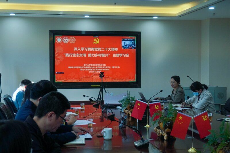 12月9日上午,厦门大学生态文明学生研习社、福建省习近平新时代中国特色社会主义思想大学生研习社(厦门大学)和厦门大学马克思主义政治经济学学习社,以“践行生态文明,助力乡村振兴”为主题,联合举办深入学习贯彻党的二十大精神学习会。姚明生态科技有限公司联合创始人、我校82级校友张宏樑,厦门大学翔安校区团工委书记、校团委副书记林蕊,经济学院党委副书记周蕾,马克思主义学院党委副书记杨建中,环境与生态学院党委副书记蔡虎堂、刘莉颖,三院学生社团指导老师、辅导员和学生社团代表参加此次学习会。学习会采取线上线下相结合方式进行,由环境与生态学院研究生方俊华主持。