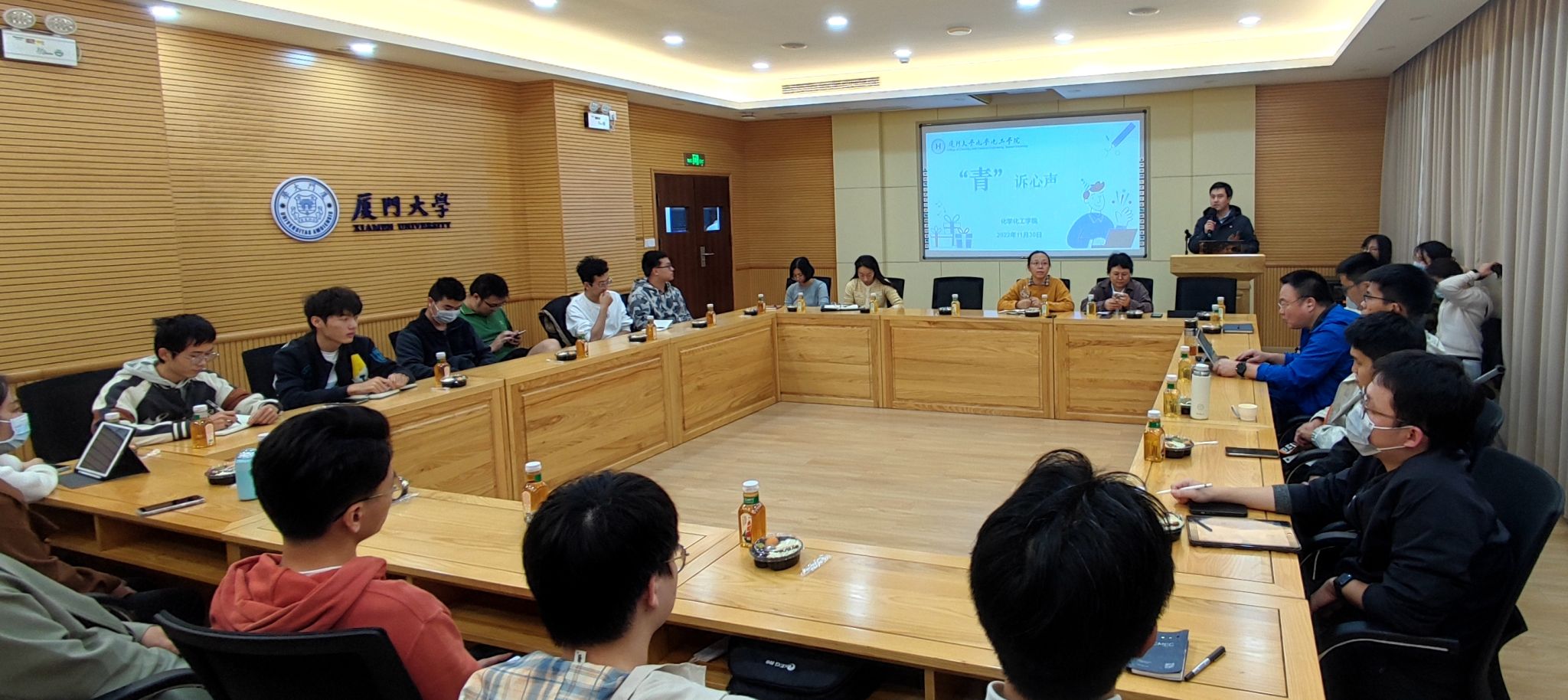 本科生提出学校医保政策的疑问、健康登记的事项、宿舍生活的问题等,学工组辅导员老师当场解读医保政策,引导树立“个人是疫情防控第一责任人”意识,同时本着“能解决的立刻解决,难解决的继续协调”的原则,立即联系公寓办等相关职能部门。就学生们关心的宿舍管理问题,党委副书记刘俊杰还谈起嘉庚先生督建学生公寓楼的理念与趣事,鼓励厦大学子要传承嘉庚精神,踔厉奋发、砥砺前行。研究生提到经济补助偏低、就业实践较少的问题,副院长吕鑫教授回应“学院将探讨助研、助教岗位的增设与管理相关问题”。副书记聂鑫补充道“学校学院正在努力开展‘访企拓岗’专项行动,以后将有更多的机会与企业交流合作,满足同学们想了解行业的期许”。伴随交流的深入,话匣子逐步打开,现场气氛活跃、融洽。