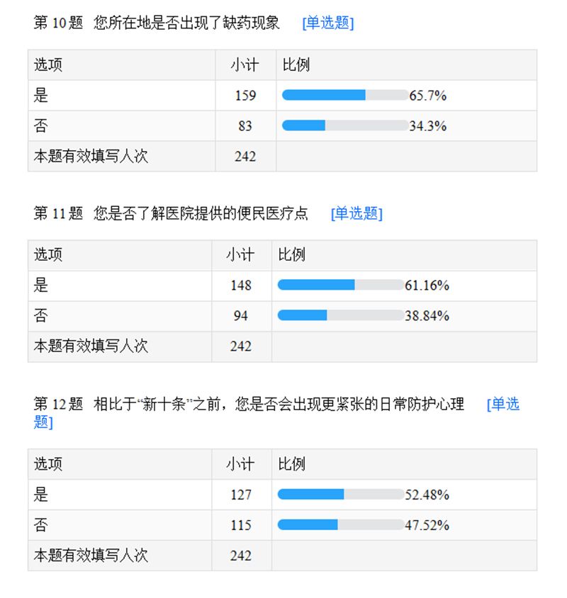 根据问卷结果,在得到有关“新十条”的消息后,有52.48%的人出现更紧张的日常防护心理,而47.52%的人选择了否。32.23%的人得到的正面消息多,19.42%的人得到的负面消息多,48.35%的人则表示正负面消息差不多。