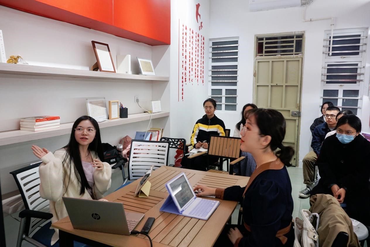 为进一步深入学习贯彻习近平新时代中国特色社会主义思想,积极探索理论与实践相结合的发力点和创新点,2023年11月24日晚,中国语言文学系2022级文学硕士班团支部于芙蓉二“青马工程”实践基地开展第四次学习贯彻习近平新时代中国特色社会主义思想主题教育专题学习会。本次团课进行“挺膺担当”专题学习,由团支书张颖欣主持。