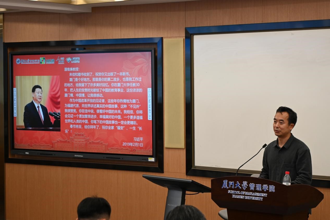 2019年春节,习近平总书记给管理学院外籍教授潘维廉回信,祝贺他的新书出版,感谢他把人生30年的宝贵时光献给了中国的教育事业,相信他将会见证一个更加繁荣进步、幸福美好的中国。2019年7-8月,潘维廉与厦大师生历时31天重走中国,行程近2万公里。作为2019年全程与潘维廉一起重走中国的老师,揭上锋通过朗诵总书记回信、展示当年代表性照片以及分享自己的亲身感悟,带头解读了回信精神。