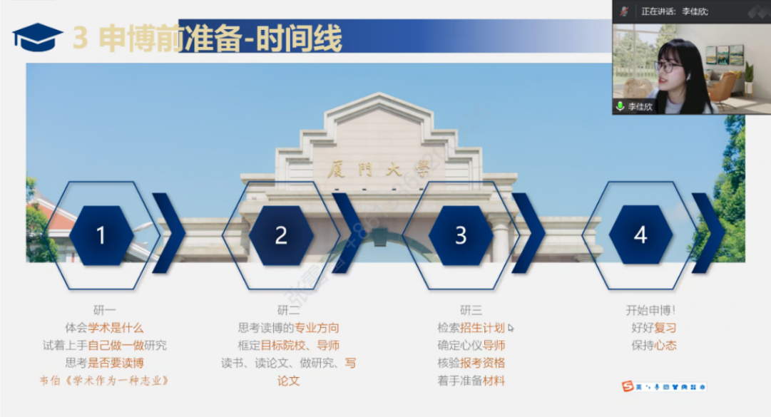 2020级语言学及应用语言学专业硕士研究生李佳欣,现为厦门大学中文系2023级语言学及应用语言学专业在读博士生。她为大家详细介绍了厦大中文系的总体概况、博士招生基本情况和申博笔试面试技巧等升学经验,为同学们提供了一份宝贵的申博指南。