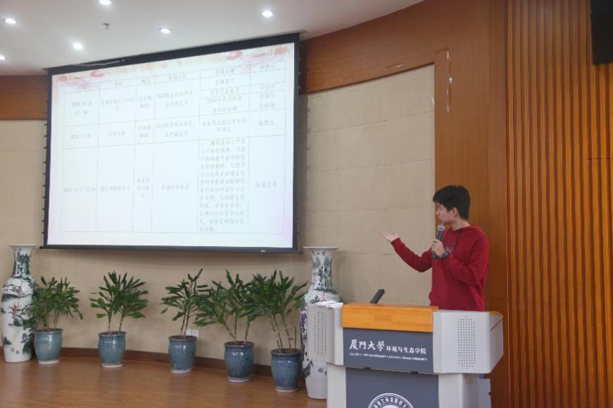 11月26日中午,环境与生态学院2024年环生团校暨党团活动月启动仪式于金泉楼B103顺利召开。本次党团活动月的主题为“筑梦新时代,青春正当燃”。学院党委副书记蔡虎堂、妇委会主任陈鹭真教授、团委书记郑淑真、本研团支书和2024级全体新生参与了本次活动。活动由本科生团总支书记张皓源同学主持。