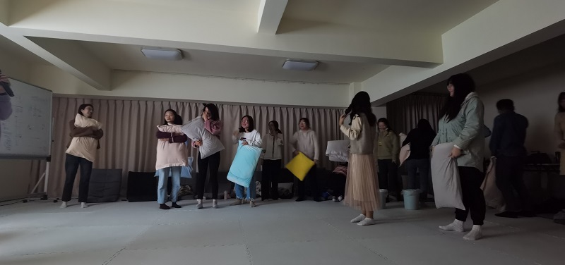 所谓的MBA情绪管理大法实际上是根据不同的情绪强度,选择不同的流动方法,M是动,B是呼吸,A是觉察。据此,调节情绪分三步走:第一步,觉察自己的情绪;第二步,大口吐气,打开喉咙,让能量出来;第三步,去活动我们身体具有攻击性的地方,让情绪的强度快速下降。随后,芳芳老师带领大家体验了“情绪宣泄”,在老师的引导下,大家抖动身体、肆意发声,接着还体验了“枕头大战”,通过敲打枕头的方式发泄情绪。整个活动下来,精疲力尽,但是内心又感到非常放松。