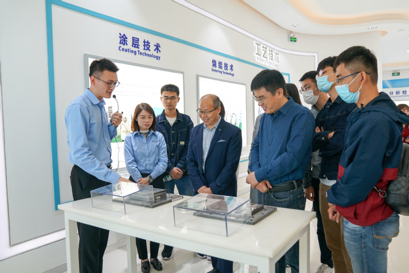 在三环集团的展厅,陈总及现场专业技术人员向同学们介绍了光纤陶瓷插芯,陶瓷封装基座,氧化铝陶瓷基板,接线端子,燃料电池(SOFC)隔膜片、指纹识别微晶锆片、智能手机后盖、智能穿戴陶瓷部件等多种产品。师生们来到了材料加工和装配现场,参观了慢走丝,光学磨,CNC加工中心,以及自主研发的高新仪器的操作使用。通过参观学习,大家加深了对材料检测分析,结构化自动化流程的认识,对材料学科在生产制造过程中的实际应用有了更清晰的认知。