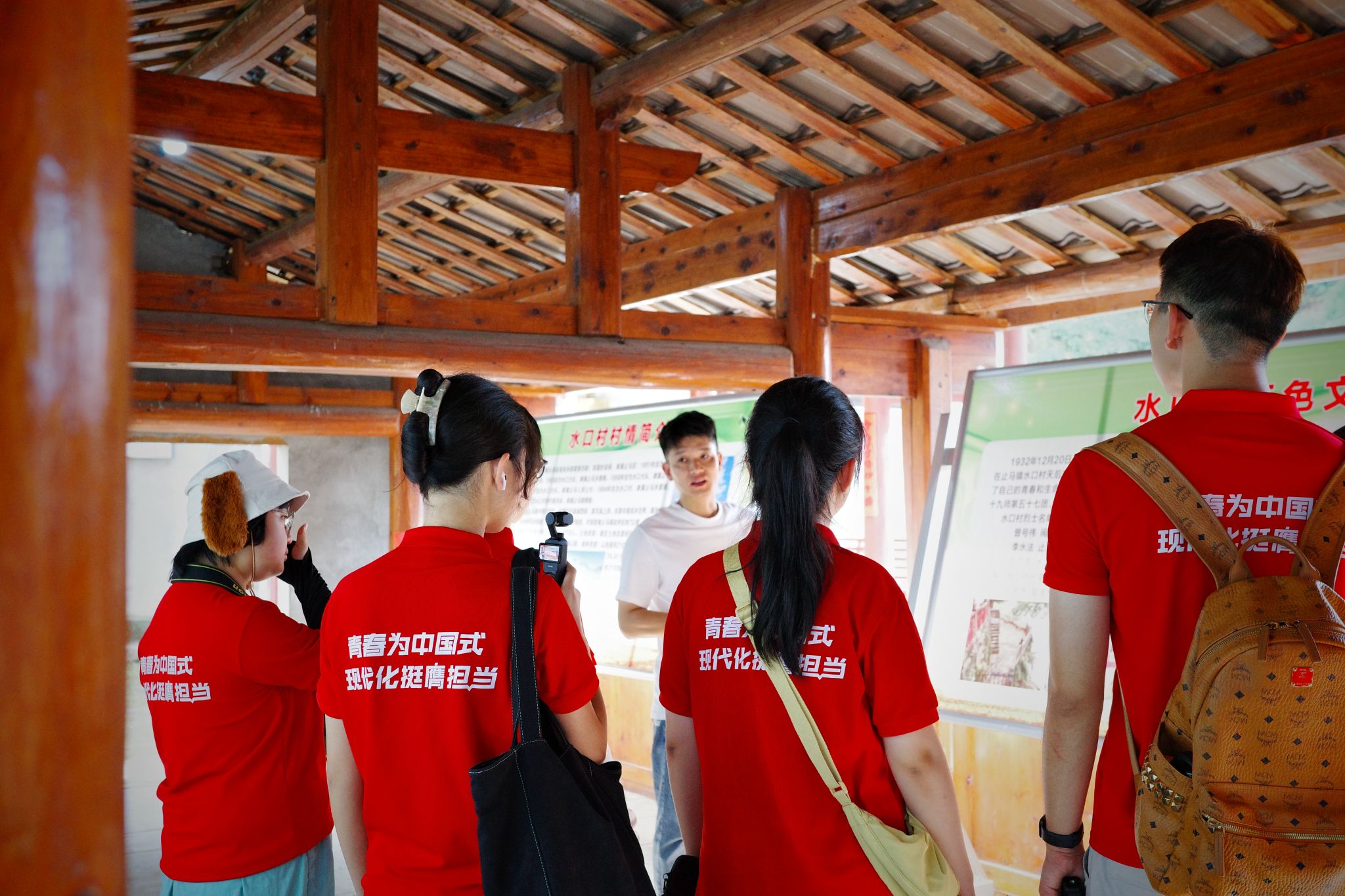 水口红二十二军军部旧址,则留存着另一种红色记忆。踏入这座承载着烽火记忆的建筑,斑驳的砖瓦仿佛仍在诉说当年的峥嵘岁月——水口村党支部书记饶斌深情讲述红二十二军在此驻扎时的故事,队员们凝神谛听,仿佛看见了当年红军战士靠着“革命理想高于天”的信念、在闽赣边界筑起红色防线的飒爽英姿。这些红色印记化作激励队员们继续前行的革命力量,指引着队员们思考如何将红色故事融入文旅宣传设计,让更多人读懂这片土地的热血记忆。