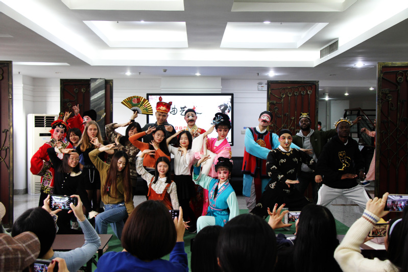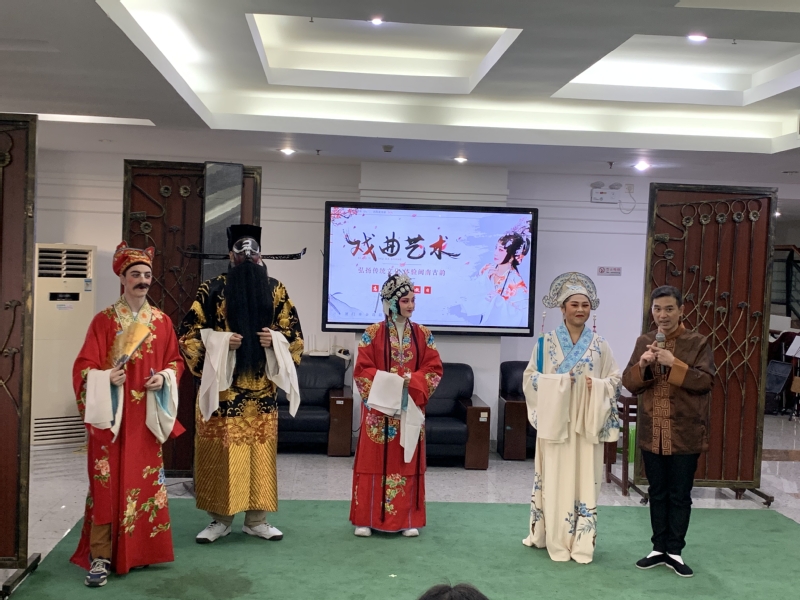 参观完嘉庚建筑后,师生一行人来到厦门市金莲升高甲剧团,受到了剧团老师们的热烈欢迎。老师们为同学们表演了经典剧目如《群芳争艳》《班头爷》《五步送哥》《三千两金》等。中外学子们积极参与戏曲装扮和动作表演,在深入地学习和体验中领略闽南传统文化的魅力。
