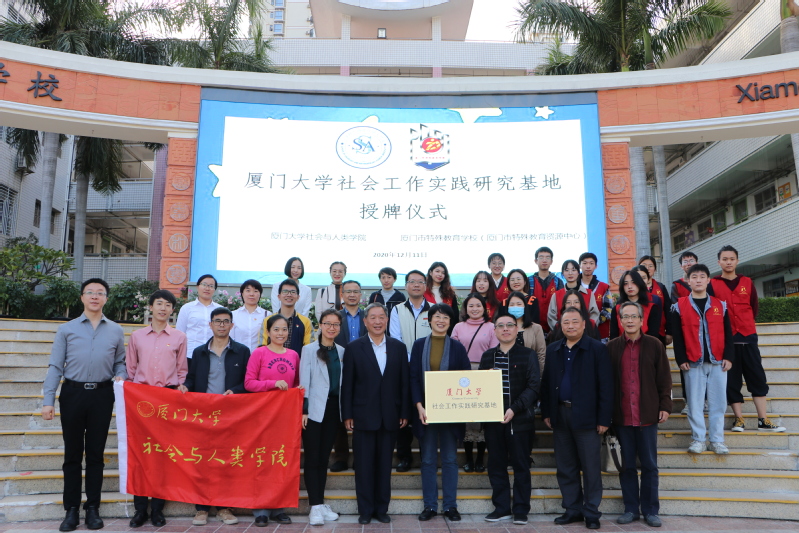 2020年12月11日下午,厦门大学社会工作实践研究基地授牌仪式在厦门市特殊教育学校会议室举行。出席活动的有原厦门市副市长、厦门教育基金会理事长潘世建,市委文明办副主任、市爱心办执行副主任虞圣坚,厦门市残疾人就业服务中心主任陈军,厦门大学社会与人类学院党委副书记陈夷,党委副书记毛毛,社会工作系系主任童敏教授,社会工作系副教授杨凌燕,社会与人类学院团委书记石林伟,厦门大学后勤集团人力部资源经理高美芸,办公室副主任、团委书记沈靓,厦门南强后勤服务有限公司副总经理麻燕凌和办公室副主任汤璐。厦门市特殊教育学校书记、校长陈莎茵、副校长黄观颖、特殊教育教师代表施静、张碧燕、张宏伟,厦门大学社会工作专业研究生代表和厦门大学本科生志愿者代表等共同参会。会议由厦门市特殊教育学校团支部书记周枫主持。