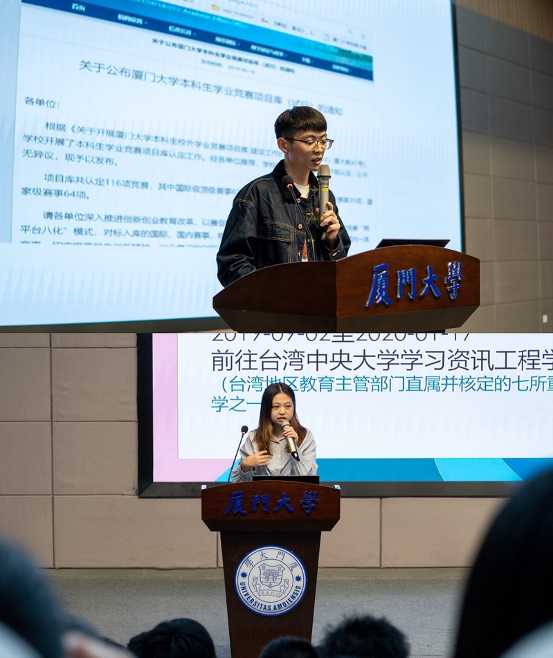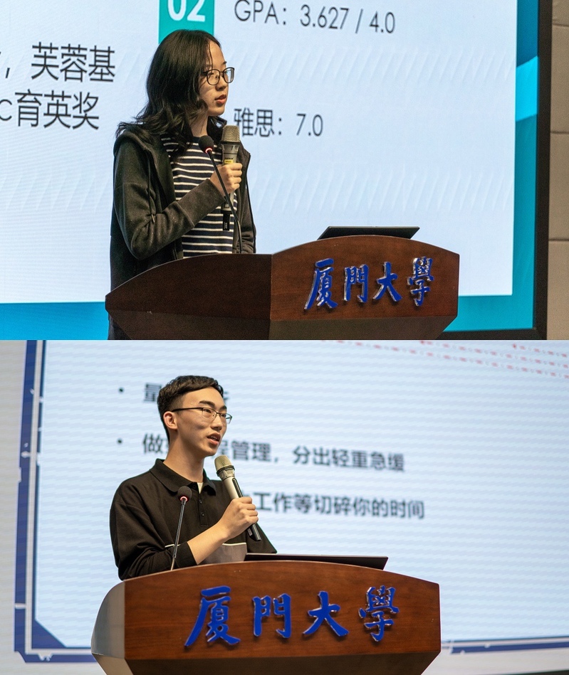 11月30日下午,信息学院“刻苦研学,学有所得”优秀学生经验分享会在翔安校区德旺图书馆二号报告厅举行,分享会邀请2017级信息与通信工程专业、保研宿舍代表游铭杭同学,2017级数字媒体技术专业、出国交流经验丰富的谢锶琦同学,2017级计算机科学与技术专业、跨专业保研的赵筱萱同学,2017级计算机科学与技术专业、保研清华的刘明辉同学四位信息学院优秀学子作为主讲人,分享学习生活中的宝贵经验。本次分享会由2020级本科生邓雪阳同学主持。