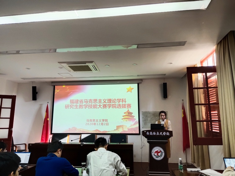 为促进马克思主义高层次人才培养,切实推进习近平新时代中国特色社会主义思想进教材、进课堂、12月2日下午,福建省马克思主义理论学科研究生教学技能大赛学院选拔赛在囊萤楼216报告厅举行。党委副书记杨建中、副院长张艳涛和研会有关负责人受邀担任评委。比赛由研会主席团执行主席朱晴主持。