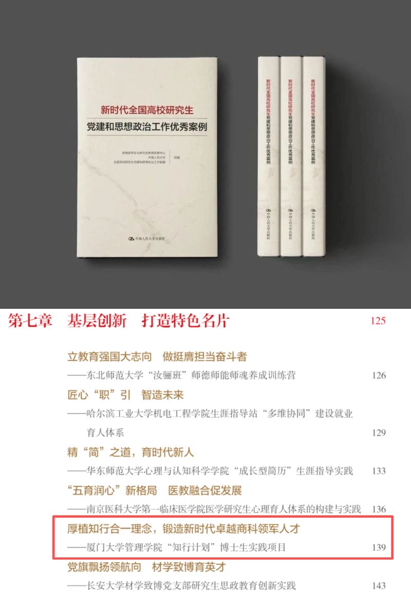 近日,教育部学位与研究生教育发展中心与中国人民大学、全国高校研究生党建和思想政治工作联盟联合出版了《新时代全国高校研究生党建和思想政治工作优秀案例》一书,管理学院案例《厚植知行合一理念,锻造新时代卓越商科领军人才——厦门大学管理学院“知行计划”博士生实践项目》入选。