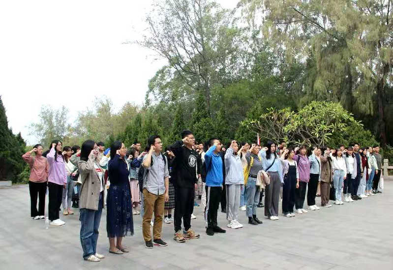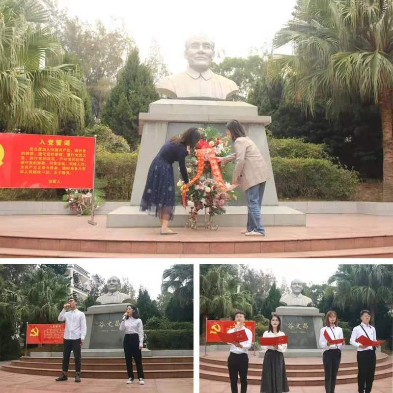 紧接着,同学们来到谷文昌纪念馆。谷文昌同志是东山县原县委书记,他带领东山人民治沙造林、打响“东山保卫战”,让“荒岛”变“宝岛”,用实际行动赢得百姓爱戴和敬仰。正如习近平总书记所说,谷文昌同志的事迹“展示了一名共产党员和领导干部的坚强党性、远大理想、博大胸怀、高尚情操,是县委书记的好榜样”。参访过程中,学生党员们被谷公“如不治服风沙,就让风沙把我埋掉”的铮铮誓言所打动,亦为谷公坚定不移的理想信念、一心为民的公仆情怀、求真务实的担当精神、艰苦奋斗的优良作风而动容。在谷文昌陵园,师生党员通过向谷文昌塑像敬献花篮、诗歌朗诵、歌曲演唱等形式表达对谷公的敬仰与追思,并在塑像前重温入党誓词。