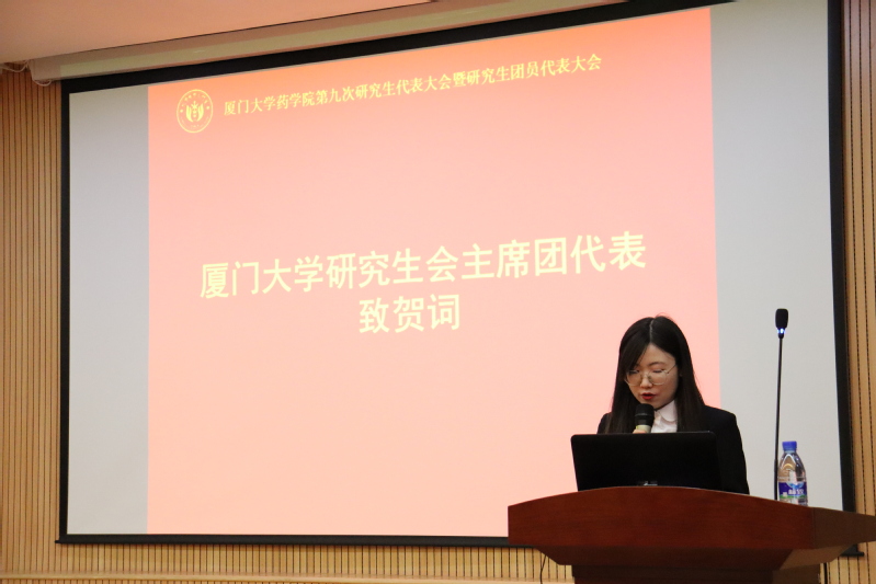 大会在雄壮的国歌声中开幕,裘依梅代表厦门大学研究生会对大会的召开表示祝贺,她肯定了药学院研究生会长期以来优良的工作作风和取得的成绩,并希望学院研究生会能够进一步落实改革精神,始终坚持服务同学的宗旨,勇于直面困难和挑战,不断进取、开拓创新,不断谱写新时代的青春之歌。