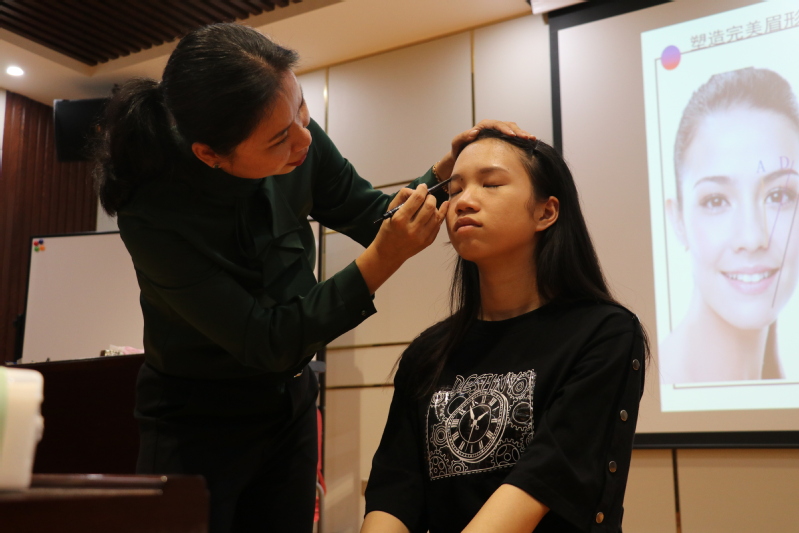 讲座开始,邱老师首先给大家介绍了化妆的重要性。她通过多组人物化妆前后照片的对比,向大家展示了化妆给人的形象带来的巨大改变。接着,她向大家介绍了化妆的基本步骤、化妆工具的类型与选择。