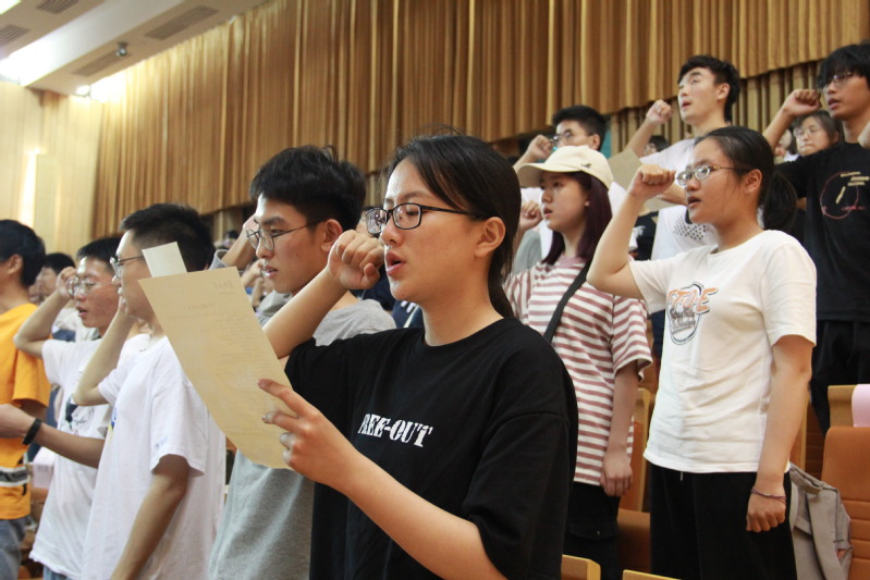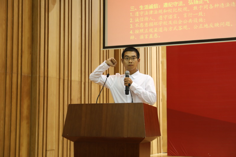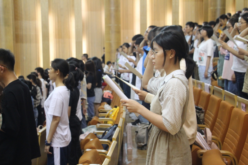颁奖仪式结束后,全体新生起立,宣誓并签订《厦门大学学生诚信承诺书》。“言必诚信,行必忠正。”诚信是立身之本、为人之道。大家在2020级本科新生郭欣诚的带领下高举右拳,庄严承诺,立志在未来的学习生活中恪守学术道德的诚信,秉持为人处世的真诚,严以修身,立己达人。