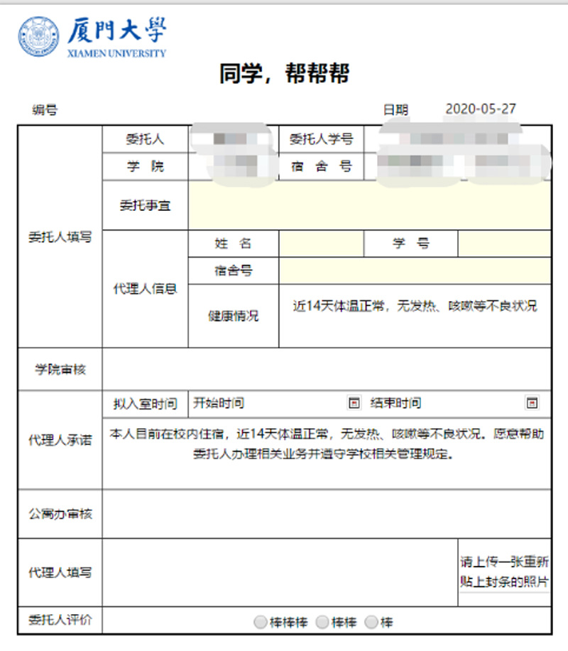 公寓办活动采取“寻找对接人-线上申请-辅导员审核-审核成功-同学取件”的模式:首先在PC端登录网址进入平台进行厦大统一身份登录,之后搜索“同学帮帮帮”进入活动平台,代理人与委托人分别填写信息,审核过后进行代取。