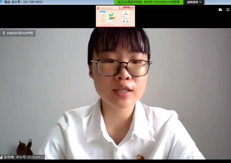 2019级学术硕士党支部书记李若楠则从“思想引领,凝聚战‘疫’共识”“躬身实践,贡献青春力量”“建强堡垒,锤炼坚定党性”三个方面,讲述了自己在疫情期间带领支部成员打造坚实战斗堡垒、坚定理想信念的具体做法,发挥党支部“七个有力”,构筑红色防火墙。