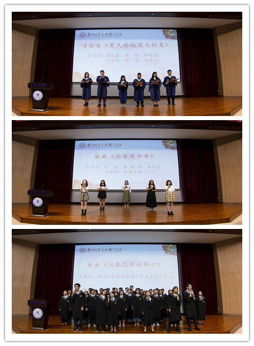 滕伯刚教授、张琥书记共同为2020届优秀毕业生颁发了荣誉证书。紧接着2020届毕业生依次上台,接受学院赠予的刻有自己名字的毕业戒指。小小的一枚毕业戒指仿佛是同学们在厦大公卫求学生活的缩影与总结,它象征着一种身份的跨越,象征着母校精神的延续与发扬,它是学院对每一位毕业学子求学之旅的肯定,也承载着学院对每一位毕业生未来人生深深的祝福。毕业生们也纷纷为学院献上了精彩的表演,他们将毕业季对母校、对师友深深的留恋和对未来生活美好的期待与祝福都融进了那深情的朗诵、温暖的歌声中。诗朗诵《夏天的相遇与别离》、歌曲《你曾是少年》、合唱《凤凰花开的路口》,情真意切,深深地感动了在座师生。