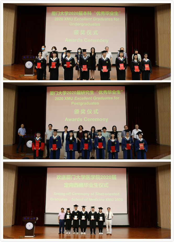 会上宣读了“2020届研究生毕业生名单”、“2020届本科毕业生名单”与“2020届优秀毕业生名单”,由附属医院、教学医院领导为受表彰的优秀毕业生颁发荣誉证书。接下来,韩家淮院长、张建安书记为厦门大学医学院2020届西藏定向毕业生颁发纪念品,鼓励他们扎根西藏,服务祖国。