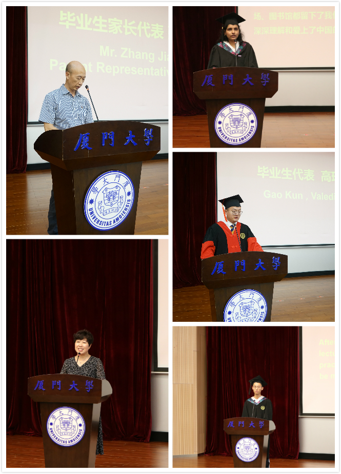 本科毕业生代表高达品、研究生毕业生代表高琨、MBBS留学生代表SAKSHI TIWARI依次发言,他们深情回忆了大学的点点滴滴,并衷心感谢学院和老师的教育培养和关怀支持,表示会时刻牢记母校“四种精神”和“仁心仁术、止于至善”的院训,努力拼搏,不负青春。家长代表阴锐梅女士和张剑川先生感谢学校和学院对子女的精心栽培,并寄语全体毕业生要懂得拼搏、谦逊和善行,用一颗感恩的心回馈父母、母校,报答祖国。