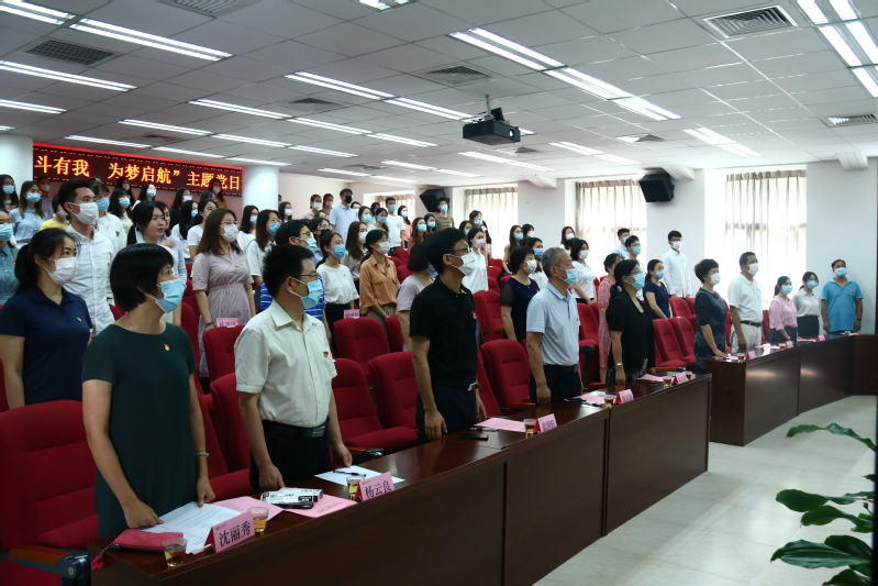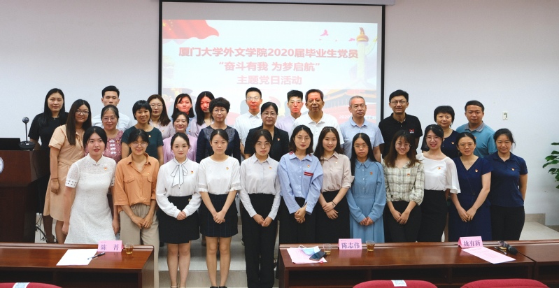 6月17日,由厦门大学外文学院毕业生党员跨支部联合举办的毕业前最后一次“固定党日+”活动——外文学院2020届毕业生党员“奋斗有我 为梦启航”主题党日活动在德贞楼112报告厅举行。校党委组织员、党建办副主任姚有新,校学生工作部(处)副部(处)长袁国柱,校团委副书记文静,校基层党建工作联络员黄定基,外文学院党委书记陈志伟,院长陈菁,学院党委副书记杨云良、沈丽秀,党委委员、副院长徐琪等受邀出席本次活动。毕业生党员在线下和线上两个会场参加活动。活动由2017级硕士研究生第一党支部书记臧康华主持。