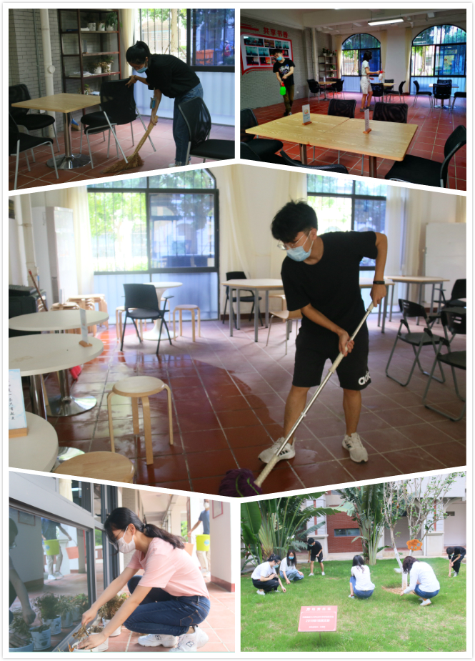 “习近平总书记反复强调年轻人要‘自找苦吃’,希望党员同志能带头吃苦,带头劳动,在日后的学习生活中再创佳绩” 听完同学们的发言,葛郝锐总结道。党课结束后,党建指导教师、劳动指导员与党支部全体到场同志拿起扫把、拖把、水桶、抹布等劳动工具,开始了热火朝天的“一站式”学生社区大清扫工作。14间房间、680平米大小、几个月被封闭,没有让参与劳动实践的师生们打退堂鼓,经过了2个小时打扫,整个“一站式”学生社区焕然一新。因疫情原因,许多盆栽无法及时养护,同学们充分发挥自己的生物专业特长,通过移栽、分株等方式,将大半绿植救活并重新装点于社区的各个角落。主要负责“一站式”学生社区绿植装点的魏雅婷同学说:“看到自己将课上课下学到的知识用在了生活中,倍感高兴!”。“一站式”学生社区大清扫即是一场别开生面的劳动教育,也是一次志愿服务。完成劳动后,已经满身是汗的吴帛轩同学说:“我们是看着‘一站式’学生社区从无到有的,虽然我们即将毕业了,可能不会再到里面学习,但是能为后面回来的学弟学妹们提供更加温馨、整洁的学习生活环境,就是我们‘为人民服务’的初心。”