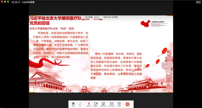 会议中,王金坤同学首先带领大家研读学习“习近平主席给北京大学援鄂医疗队全体‘90后’党员的回信内容,并指出自己感触颇深。其他各位党员同志围绕主席的回信,结合自身学习和工作实际进行了细致详实、深入浅出的分享。支部宣传委员蔡晓海同学认为:“习近平总书记对广大青年寄予了极大的期望和鼓舞,我们要争当新一代自信青年,发扬艰苦奋斗的精神,以更加健康向上的精神面貌向着明天,为祖国发展贡献力量。”党员康珊娜同学认为:“习近平主席的话语重心长,言犹在耳,是对广大青年奋力夺取疫情防控和实现经济社会发展目标双胜利的极大鼓舞,也是对新时代中国青年的谆谆教诲。我们年轻一代需要树立远大理想、热爱伟大祖国、担当时代责任,承担自己的社会责任,为国家建设贡献力量。”党员阳名钢同学则说:“我们要牢记习近平总书记对广大青年的殷切教导,担当民族复兴的伟大重任,脚踏实地做事,诚实守信做人。‘扶贫、战疫’,从我做起,从现在做起,从点滴小事做起。”······虽然感想各有不同,但是大家都表达了青年当自强,为祖奉献的热诚之情。