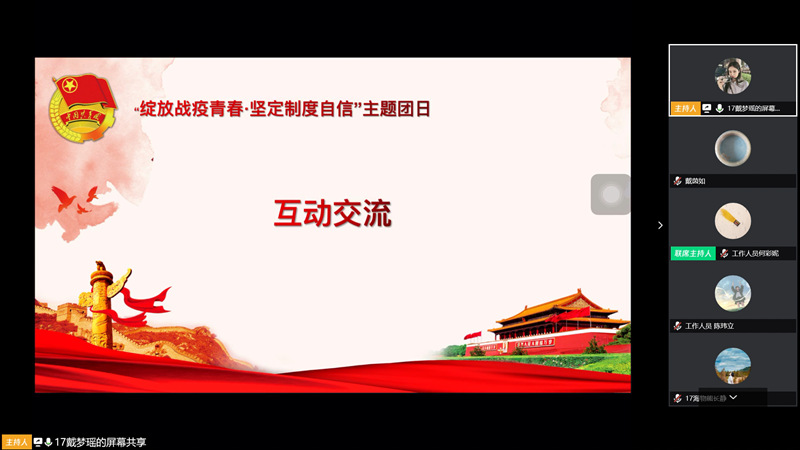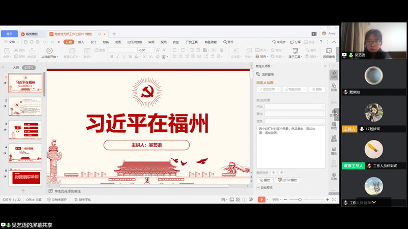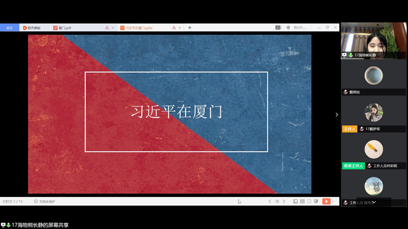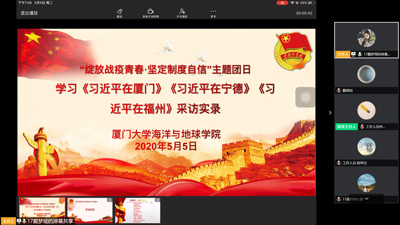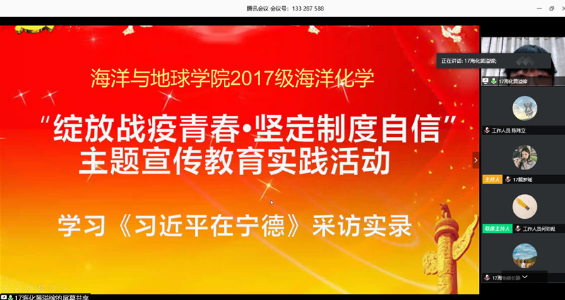 为深入学习领会习近平新时代中国特色社会主义思想的理论逻辑和实践逻辑,5月5日晚,海洋与地球学院团委组织开展了以“绽放战疫青春,坚定制度自信”为主题的宣传教育活动,活动包括线上集中学习研讨《习近平在厦门》《习近平在宁德》《习近平在福州》系列采访实录及交流学习心得体会。此次活动由学院兼职团委副书记戴梦瑶主持,70余名团员参加。