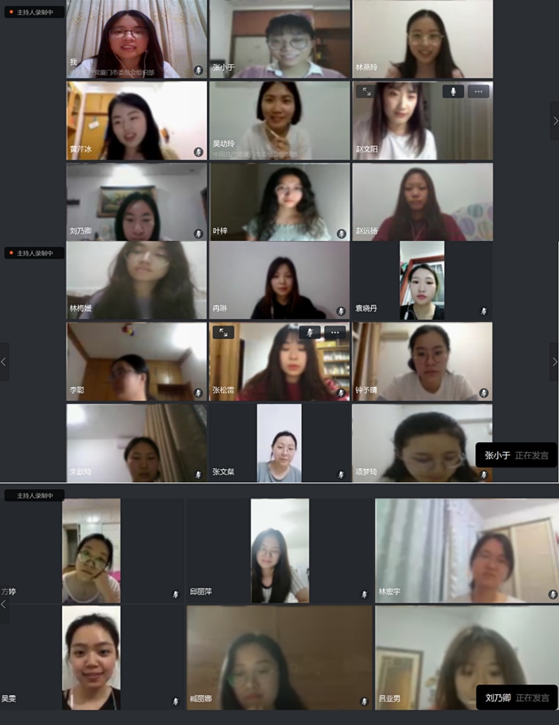 五四青年节当天,厦门大学外文学院2019级翻译硕士党支部联合南京大学外国语学院2019级英语学硕党支部,以云会议的形式共同举办“‘厦南’青年说,青春正当时”主题党日活动。双方党支部成员跨越空间线上相聚,讲述青春故事,分享青春关键词,共同学习进步。