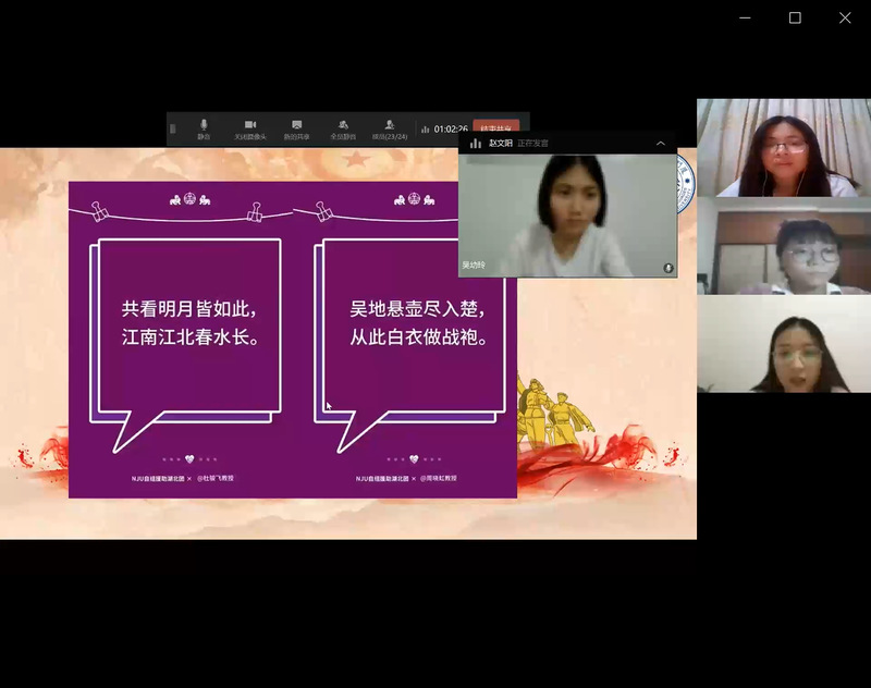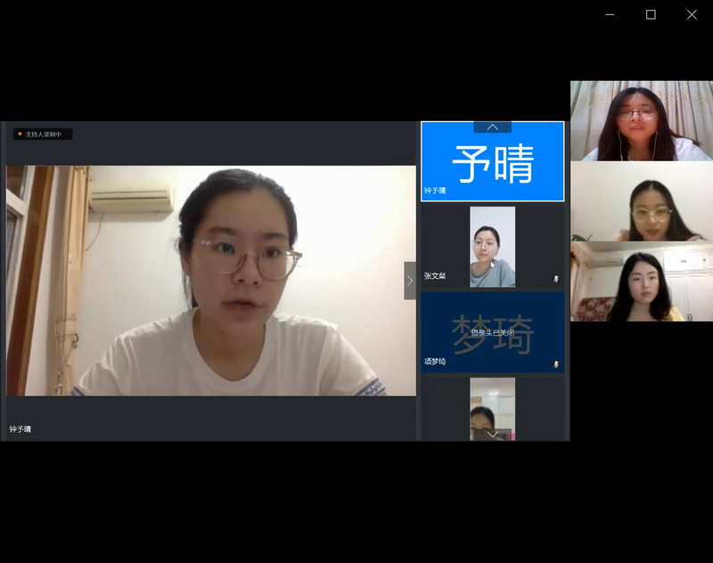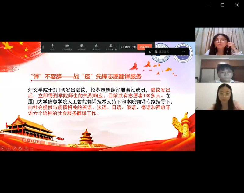 在“五四”青年先进事迹分享环节,厦门大学外文学院2019级翻译硕士党支部黄芹冰讲述了厦门大学战“疫”故事,介绍了我校在疫情期间取得的重大突破——49天研发新冠病毒抗体检测试剂盒,并带领大家一同观看了厦大 “国家队”开展抗疫科研攻关的相关视频。吴幼玲则与南大青年们介绍了厦大外文学院战“疫”先锋志愿翻译服务站的有关情况,自2月初该服务站成立以来,2019级翻译硕士党支部承担了大部分的中英翻译和校对工作,并结合这项工作申请并获批“译全会,战疫情”校级党支部工作立项,支部党员们结合专业所长,充分发挥先锋模范作用,为战“疫”助力,展青春风采。